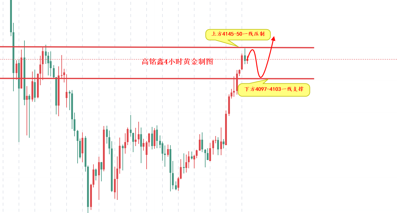 今天黄金守住了4100整数关口,说明当前市场情绪还是倾向于看涨的。符合高铭鑫本人最近给出的4097-4103一线做多的策略思路,今天黄金多头持续突破,截止目前4200一线也是近在眼前,下方我们关注4145-50一线支撑,此位置也是近期上涨的压制点,大趋势看涨一直是本人所强调的思路,午夜4200一线有望再次突破,大家尽量不要逆势操作,操作上以回踩做多为主。 黄金投资思路: 1、黄金4145-4150一线多,止损4138,目标4200-10一线,破位持有!!! 注:以上文章由高铭鑫原创,转载请注明出处。高铭鑫温馨提示,投资有风险,入市需谨慎。以上仅代表高铭鑫个人观点,不作操作依据,据此操作风险自