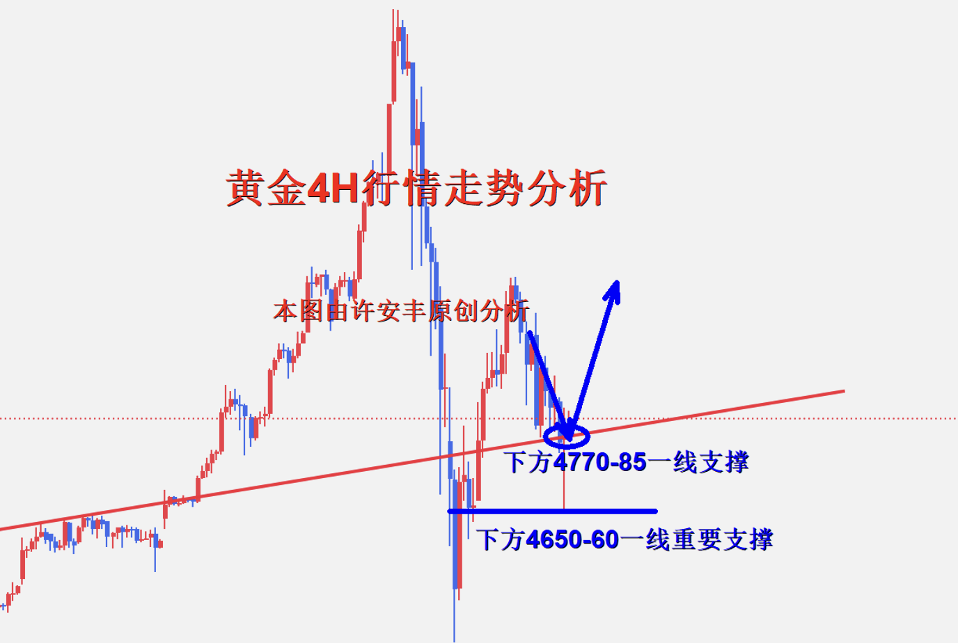 黄金周四早间开盘先延续反弹拉升至5023一线后承压后出现200美元的回撤,最低触及4790一线附近,昨日反弹突破上轨但没持续太久美盘再打回通道内受下轨支撑,午夜先关注日内低点4780-90一线支撑,看此位置的有效得失,重点关注周四收线是否能突破日内新低情况,近期国际局势美伊谈判都将会是黄金涨跌波动的关键神经枢纽,大起大落的行情我们必须要稳健对待,黄金整体还是震荡上行为主,操作上继续保持回踩做多思路进行。对黄金感兴趣却无从下手或者操作不理想的朋友可以与老许本人前来沟通交流。 从4小时行情走势来看,上方关注5020-5030一线短期压制,下方短期关注4785-4790一线支撑情况,重点关注下方4