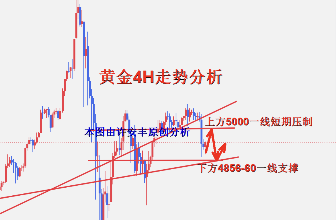 黄金周四午夜跌破5000一线关口,跌破了下方重要支撑位置,那么黄金也将迎来短期的调整回落,昨日黄金小时线我们也反复提示如果不能上破,那么极有可能迎来极端走势,就是超出我们预期的洗盘节奏,没有冲破站稳5100一线关口位置,那么黄金下行调整也是技术面所需求的,日内反弹承压5000附近继续空。对黄金感兴趣却无从下手或者操作不理想的朋友可以与老许本人前来沟通交流。 从4小时行情走势来看,上方关注4985-5000一线短期压制,下方短期关注4860-4856一线支撑情况,操作上继续以区间操作进行,以稳健操作为主,具体操作策略我会在盘中提示,及时关注。 黄金操作策略: 1、黄金回踩4856-4860一线