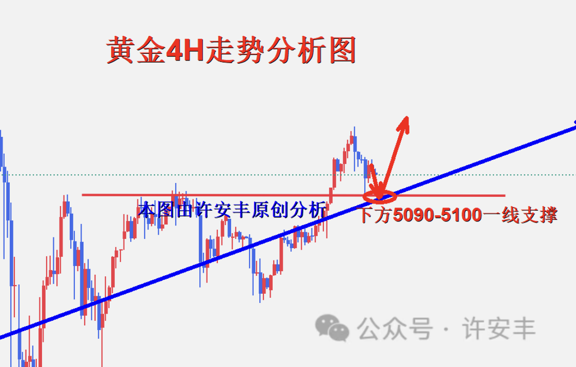 黄金近期进行触底反弹,但是没有跌破本人分析的5090一线重要支撑位置,昨晚最低触及5092一线进行反弹,金价再次反弹至5150一线附近震荡,可以这样概括,每次的回撤触底就是为了后面反弹拉升做准备的,这即是规律也是大趋势的引导,所以我们每次回踩都是要把握住进场的机会,重点关注5090-5100一线重要支撑,操作上保持回撤做多策略不动摇,整体上行结构非常明显,多头持续保持强势崛起。不断刷新高点。如果你目前操作不理想,希望许安丰能让你的投资少走弯路,欢迎前来沟通交流! 从4小时行情走势来看,上方关注5270-5280一线短期压制,下方关注5140-5145一线短期支撑情况,重点关注5090-510