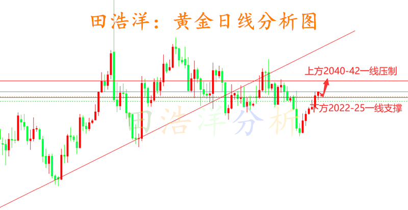 昨天的黄金还是一个修复行情,日线收十字星,周线的2031的压力还是没有有效的突破,不过短线多头还是非常强,一直是在2020-2032徘徊中,如果今天多头可以再次去破2032的位置,才有可能继续上破,反之可能会带来技术性的回踩,日线形态还是多头,已经连续6个交易日上冲,多头趋势毋庸置疑,这个位置日线不见阴都不可以判断它是见顶信号,所以思路还是要偏向多头,今天短线看震荡,大趋势看多。 从日线来看,我们目前关注2020-2023一线短期支撑,不破这里可以多一下,关注上方2040-42一线压制,日内回踩可以找机会多,中间位置一律多看少动谨慎追单,耐心等待关键点位进场,具体操作策略我会在盘中提示,及时