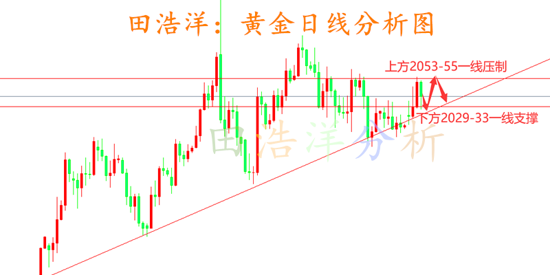 昨日黄金技术面企稳2033关口迎来震荡反弹回升,午后慢涨上行承压2040关口陷入窄幅震荡,晚间美盘二次回踩下探并企稳2036关口迎来强势探底回升反弹走强,最终在晚间加速冲高刺破2055关口承压回落,凌晨在美联储议息会议利空影响下金价二次反抽承压2050关口再度压制回落震荡破底收盘,日k线报收冲高回落长上影,整体价格依旧延续近期多空宽幅震荡区间,多空均无太大延续性。 从日线走势来看,今日上方压力继续关注昨日美盘开跌口2050-2055区域,下方支撑关注2029-30,整体依托此区间高空低多循环参与继续看震荡,中间位置一律多看少动谨慎追单,耐心等待关键点位进场,具体操作策略我会在盘中提示,及时关