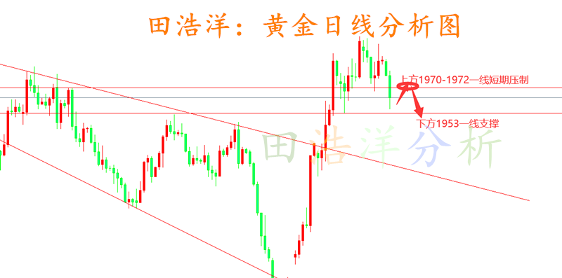 黄金的早间触及1970-1972的位置,昨天跌破这个位置的破位置确定了空头的地位,在K线形态上形成了一个弧形的K线形态,这是一个看跌的信号,而且日线级的头肩顶形态也是初现,这些都是大空头启动的信号,我们不去猜测遥远的趋势,就目前田浩洋看见的盘面已经是空头,所以操作上我们继续找空头上车的机会,昨天的行情1970空也只是小喝汤,早盘1971我们再次空了,今天的1953很关键,这个位置破了将会带来瀑布跌。 从日线分析来看,今日上方短线阻力关注昨日欧盘开跌口1970-72附近,日内反抽依托此位置可直接进场做空,下方目标位关注1960-1958附近,日线级别在未强势突破且站稳1980关口之前逆势多单需