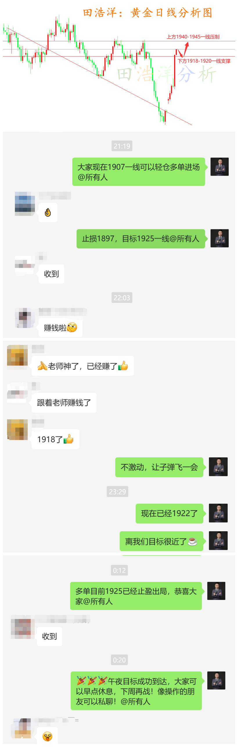 方向对了不怕路远,用时间见证实力,用实力赢得未来,让信任成为利润,用利润解除疑惑。市场瞬息万变,顺势而为,才是王道,趋势来了就是干,不要逆势抄底,免得难受煎熬。交易切记不要意气用事,市场专治各种不服,所以一定不要扛单,相信很多人都深有体会,越抗越慌,浮亏不断放大,搞的吃不好睡不好,还白白错过很多机会,如果你也有这些烦恼,那不妨跟上田浩洋的节奏来试试,看能否找到您的治愈良药! 黄金技术面分析: 黄金在周五的交易中强势上涨,突破了关键压制,展现了过五关斩六将的势头。这种上涨趋势的延续表明,下周我们应该继续顺势操作,以1900整数关口为依托,坚定看涨,积极做多。从消息面来看,巴以冲突的加剧导致黄金