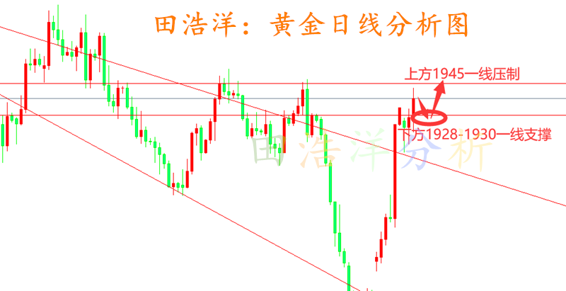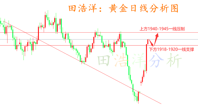 中东局势变化多端,目前的黄金依然被中东局势左右,整体是支撑黄金白银原油,黄金多头已经打开了新的上涨空间,之前的1930是压力,今天已经转换成了支撑,形态显示它的多头动力没有减弱,上面看不见顶的信号,大趋势我们还得继续看涨,之前的周线和日线的大拉升已经让黄金重新转换成了大多头形态,加之中东局势这周一直在升级,多头趋势短期是难结束的,今天继续找多的机会吧。可以依托1930这个位置的小支撑干多,形态显示更强的已经上到了1919附近,之前的1908已经是日线的支撑了,支撑在步步上移,多头目前可以遇见的超级压力是1945一线。 从日线图来分析,目前下方支撑关注1928-1930附近,上方压力关注194