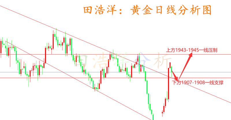 今日开盘后黄金有所回修,这也符合常理。对于目前巴以局势可能带来的影响务必要认清,从现有的状态来看,本次巴以冲突是根本不可能在短期内缓和解决的,所以未来黄金还是可能会受到避险买盘持续走高的,目前所能见到的回修都是短暂的,甚至可将每一次的回修视作为多头再参与的机会。 从日线分析来看,尽量避开做回调,日内下方一度回撤至1910下方,重点关注1905-1907一线支撑,从现有状态来看,回撤至此的可能性是比较低的。后期上方可关注1940-45一线压力测试,在避险情绪不消的情况下,上方测试1980都是很有可能的。综合来看,晚间黄金短线操作思路上田浩洋建议以回调做多为主,反弹高空为辅,上方短期重点关注19
