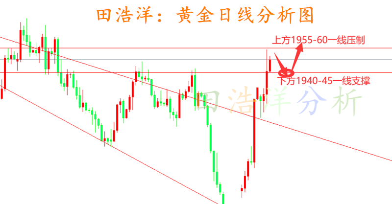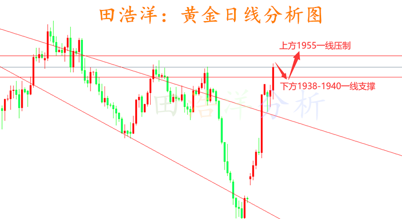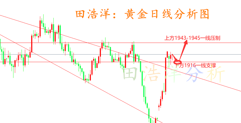受到巴以冲突的不断影响,金价将会持续呈现震荡上升的格局,明朗的走势让我们在操作布局上省去了选择方向的顾虑,而这正是我们想要的走势,在大好的行情面前,方向对了,坚持必将抵达终点,方向错了,停止就是进步,转身就是利润,保持乐观的心态,放下才能收获众多! 从技术面分析,均线还是呈现金叉的状态,而短期一小时线的走势在近期阶段走出了新的多头趋势,日内均线支撑与趋势线支撑均处于1925附近且不断向上发散,而操作上大可不必等到价格回落至此才开始做多,大好的多头行情稍有回落果断大胆做多!此前一直看好的1947关口即将如期抵达,不要怕没有空间,现价距离2000的关口还有大把利润等你来收割! 从日线图来分析,目