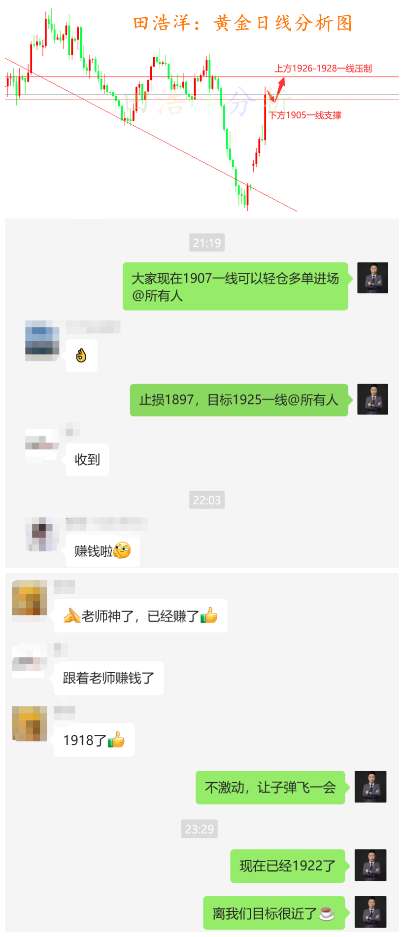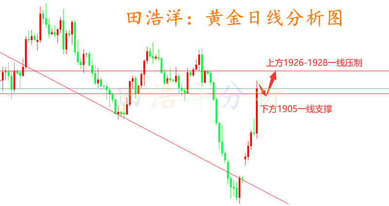 晚间黄金仍然保留看涨预期,市场避险情绪的推动下,黄金有可能继续单边上涨。因此,晚间黄金仍然保留看涨预期。然而,目前黄金已经大幅上涨,不适合盲目追高。因为避险情绪带来的买盘力量很容易将黄金带入中长期的单边上涨路线。晚间还是以1905-1907一线看涨,黄金可能会进一步上涨至上方1925附近。然而,我们应该尽量避免盲目追高。 从日线分析图来看,上方关注1926-1928一线压制,下方关注1905一线支撑,操作上以回踩做多为主,中间位置一律多看少动谨慎追单,耐心等待关键点位进场,具体操作策略我会在盘中提示,及时关注。 黄金操作策略: 1、回踩1905一线多,止损1897,目标1925一线; 文/田