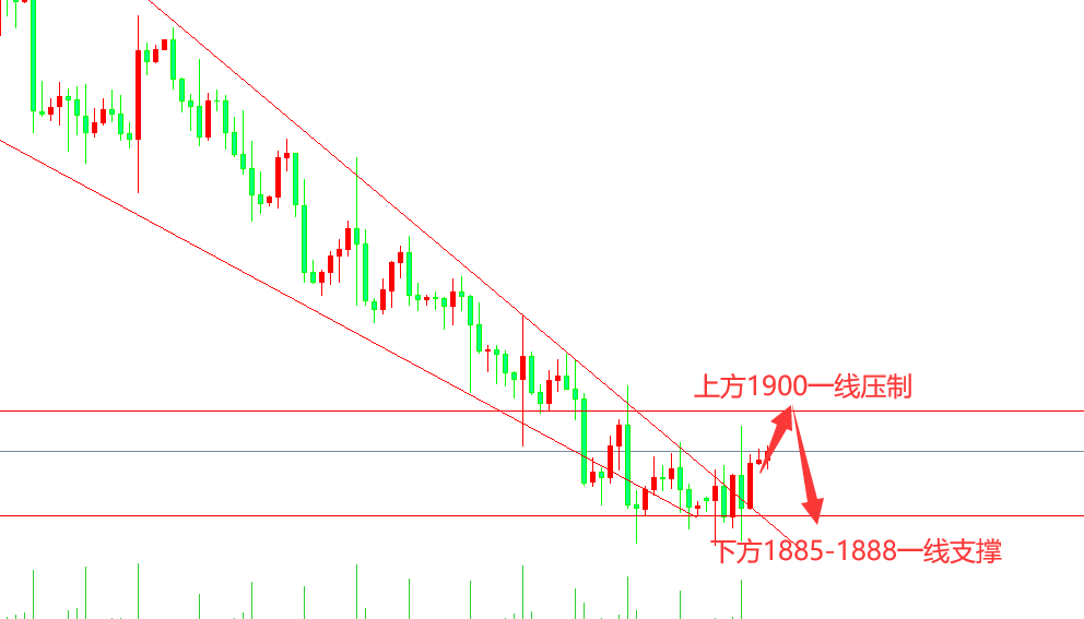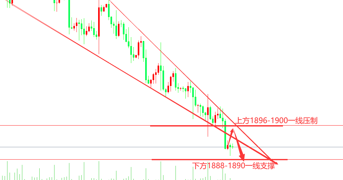 昨日黄金技术面延续弱势震荡下行破底收盘,亚欧盘价格依托1900关口小幅震荡回升反弹,晚间美盘前小幅拉升至1906关口附近压制震荡回落,晚间二次反抽刺破1906关口再度承压回落走跌,并在凌晨会议纪要影响下金价继续呈现压制回落破底1900关口,最终收盘位于1891一线报收冲高回落吊颈中阴,整体价格承压1907一线再度呈现极弱空头压制下行。 从4小时分析图来看,今日上方关注1896-1900一线压制,日内反抽依托此位置继续主空再看跌,下方目标位继续1890一线支撑破位关注破底,近期空头弱势分界线下移至1910一线,日线级别未突破并站稳此位置之前继续保持顺势主空节奏不变,具体操作策略我会在盘中提示,