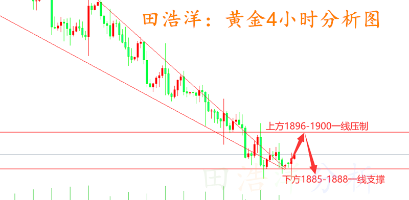 黄金连续下跌10个交易日第一次出现止跌信号,昨天日线收小阳线,注意这不是见底信号也不是趋势转变信号,它只是一个止跌信号,预示着有震荡和反弹,反弹结束了空头还会继续下探刷新低,1884还不是这波下跌的低点,田浩洋还是坚持跟随趋势,今天的思路大趋势看跌,短线看震荡修复反弹,昨天我们在1896空到1885又丰收11个点,今天继续等待好位置继续空。黄金周线已经是下破形态,在加之近期的基本面和数据的打压,黄金的空头短期难结束。 从4小时分析图来看,今日上方压力继续关注1900附近,白盘我们关注1900-1903的压制,这两个位置都是空头的上车机会,之前的低点1884形成3底,这个位置也可以短多拦截。继