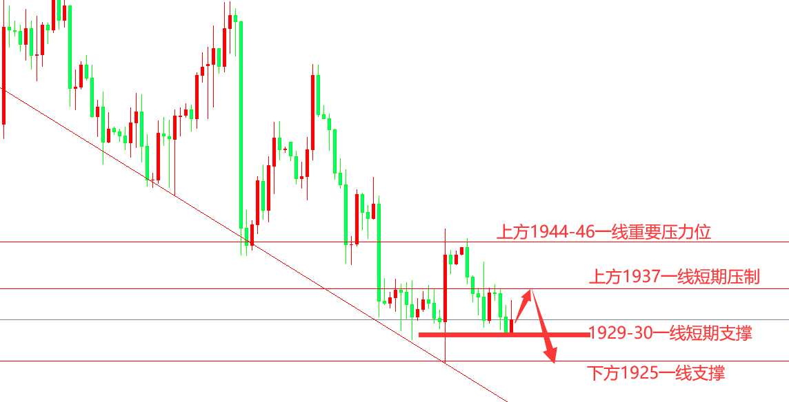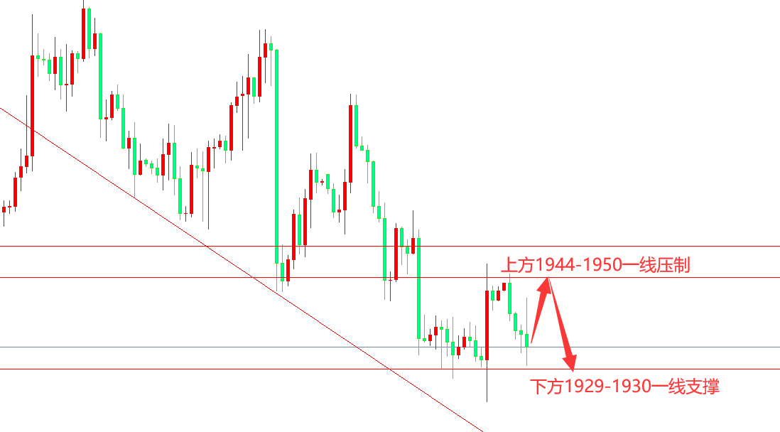 黄金市场大部分时间都是在震荡,震荡需要的耐心和等待,很多时间里等待也是交易的一部分,昨天的黄金冲高回落,日线收小小的阴,整体还是一个底部震荡中,关注之前低点1925这个位置不破都看震荡。形态显示目前是4小时的下跌通道底部震荡,如果反弹上面空间也不大,必须跑出通道才可以打开空间,震荡行情找区间比看指标正确率更高,今天的白盘我们预估的波动空间是1925-1945区间。昨日全天压制于1946下方继续呈现空头压制,短期技术面依旧空头压制。 从4小时分析图来分析,今日上方压力关注昨日开跌口1944-1946附近,日内反抽依托此位置继续主空再看跌,下方短线支撑关注1929-1930附近,重点支撑则维持于