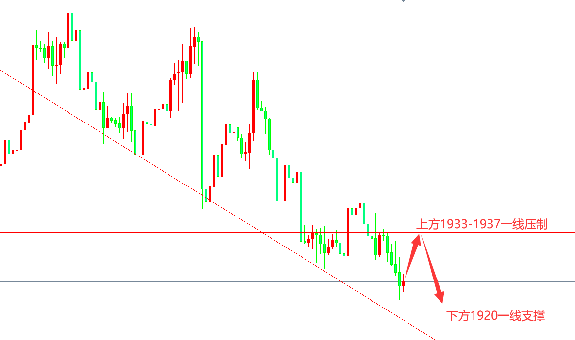 黄金4小时下行趋势线最近一直压制黄金的上涨,均线死叉向下,空头排列,没有任何理由抄底做多,反弹美盘还是受制于下行趋势压制,黄金继续下跌,除了上周五非农利多,大家这两天有看到多头很强势的时候吗?相信答案是一目了然的,黄金趋势线阻力现在下行至1937附近,没有突破站稳1937就是空,空头趋势,尽量不抄底,反弹就是纸老虎,只要反弹就是给我们干空的机会,顺势而为,不要总想着抄底,不排除运气好有抄对的时候,不过运气只能成就一时,技术和原则才能成就一世。 从4小时分析图来分析,上方短期压制在1937一线,下方短线支撑关注1929-1930附近,重点支撑则维持于1920附近,而上周五的单阳我们可以认为是空