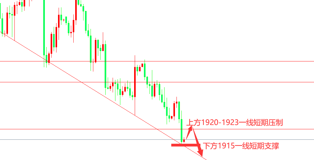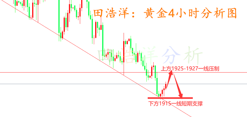 今天市场上很多看涨被狠狠打脸,很多人在白天1930都继续多了,相信他们此时已经心累无比,黄金白天反弹最高至1932一线,美盘前开始回落并在1925附近震荡一段时间,美盘后行情不断试探新低,并在晚上10:30后跌破1920一线,现在已经最低触及1915一线,目前处于1917一线震荡,整体来看,空头依旧比较强势,主要思路依旧看空,最近我也总是提醒大家反弹就空,空单才是主旋律! 美盘前文章也给出了晚间突破1920的势头比较足,现在已经得到验证,晚间未破1920之前短期的1922附近多单也在1927附近获利出局,反手1927一线空单已经于1920-22一线获利出局,多空完美收割囊中。 从4小时分析图