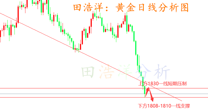 初请出局利空,一下子下拉至1810附近,但是空头并没有延续下去,在1812一线我们直接布局了多单进场,目标看1825-30一线,但是在1825时候通知全部止盈出局,午夜行情将会延续我晚间实盘给的先跌后涨,午夜反弹将会持续,大家回踩可以找机会做多,等待1825-30附近获利出局。 从日线来分析,整体延续多空宽幅震荡修复,靠近1810-1813附近可先多一次,再看震荡回升,具体操作策略我会在盘中提示,及时关注。 黄金操作策略: 1、反弹1830-1832一线空,止损1839,目标1810-1815一线; 2、回踩1808-1810一线做,止损1802,目标1825-1930一线; 文/田浩洋——