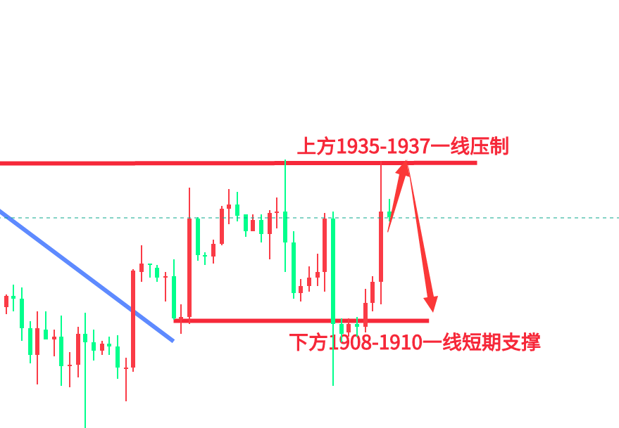 黄金昨日多头再次上扬,并且于欧盘快速突破前期高点,触及到1938附近后止步,而遗憾的是,短线内的多头并没有得到有效的上行,虽有意愿上行,但最终还是围绕于美盘开始承压回撤,那么目前的趋势仍然处于区间内的震荡,在没有突破之前,方向仍然不明,多空尚无定论,则短线内黄金我们还是需要更多的耐心等待,目前仍然处于区间性的震荡模式,仍然需要等待短线内突破后的跟进。 从4小时分析图来看,目前上方压力则继续维持于1937-1939区域,只有在突破之后,黄金才能走出一定的延续行情,否则的话,市场很有可能会走出僵局,但从大格局而言,自前期下跌以来,黄金一直是处于反弹修复或者震荡修复的形态,而且还是维持于下跌通道之