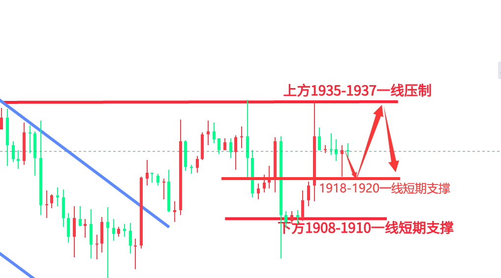 很多朋友问我,为什么一定要找个老师?我可以告诉各位朋友,一位好的老师,不仅可以实时指导,更多的是能够帮你更加透彻的分析整个行情。一天其实不用操作很多,看准行情操作1到2次即可,人又轻松,又不用熬夜,稳健的盈利,这不就是你们想要的吗?白天正常的工作,晚上有时间有行情时顺势操作一波,然后就去休息,很轻松的一件事情,开心的赚钱,正常的生活,。 黄金技术面分析: 黄金上周五非农多头拉升,最高再次触及到1934一线后止步,而后又开启了回撤修正的模式,截止到日内,最低触及到1919一线,我们在1920一线实盘也给出了进场的多单,在上方1928附近获利出局,今天回踩1919附近也几乎到达了回撤修正的极限位