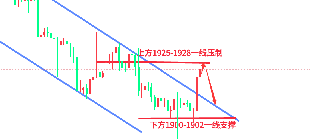 方向对了不怕路远,用时间见证实力,用实力赢得未来,让信任成为利润,用利润解除疑惑。市场瞬息万变,顺势而为,才是王道,趋势来了就是干,不要逆势抄底,免得难受煎熬。交易切记不要意气用事,市场专治各种不服,所以一定不要扛单,相信很多人都深有体会,越抗越慌,浮亏不断放大,搞的吃不好睡不好,还白白错过很多机会,如果你也有这些烦恼,那不妨跟上田浩洋的节奏来试试,看能否找到您的治愈良药! 黄金技术面分析: 昨日金价技术面整体压制1912下方迎来震荡回落破底反抽收盘,亚欧盘价格小幅反弹继续承压1912关口震荡回落走跌,午后进一步向下回落到达1902关口企稳1900整数关口上方呈现横盘震荡,晚间美盘前价格快速