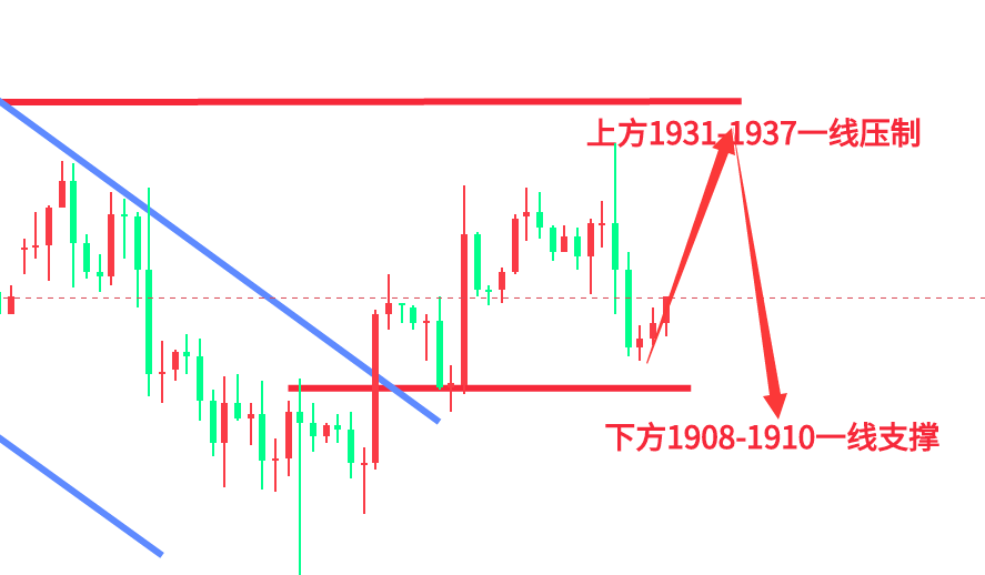 黄金整体表现还是区间震荡状态的,日k线连续收阳,而因为技术上面临技术性压制,且前期反弹节奏不是很坚实,所以技术结构重心可能会随着时间的推移而偏向于回修调整。日内黄金下方重点还是关注5、10日均线1910附近争夺,如果行情再度跌回其下,那么无疑会增加短线行情的下跌概率,下方或可再期待1900支撑回调。上方依旧关注布林中轨1937附近压制。不破上方压制依旧可以布局中线空。 从4小时分析图来看,1931-1937的压力区,之前也是多次测试和多次被打压下来,我们今天预估空间是1910-1931这个区间,震荡行情到位置直接干不要犹豫,下方支撑关注1908-1910一线支撑,依托此区间高空低多循环参与看