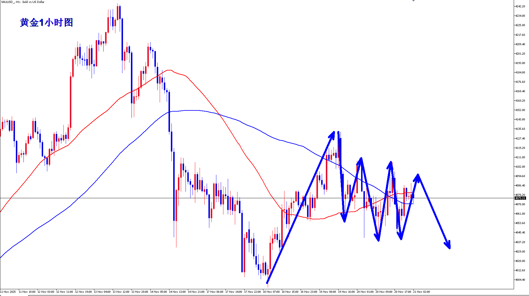 黄金早间开盘后快速反抽于4088一线后继续下跌,而下方的重要支撑则维持于前期的低点4020附近,此位置也是多头的最后一道防线,一旦被踹开的话,那么下方的空间也将会继续打开,后期的目标将继续直指4000附近,当然,这也是第一小目标而已,此位置继续破位将有可能再次冲击前期的低点3900一线,而目前总体趋势震荡偏弱,在下跌或者上涨的过程中很有可能会让我们措手不及的形态出现,而目前我们需要做的还是耐心等待到达压制口或者破位之后再选择跟进,不要盲目的追涨杀跌,很有可能会倒在震荡的路上,如果你目前操作不理想,希望田浩洋能让你的投资少走弯路,欢迎前来沟通交流! 从4小时图走势来看,上方关注4076-85一