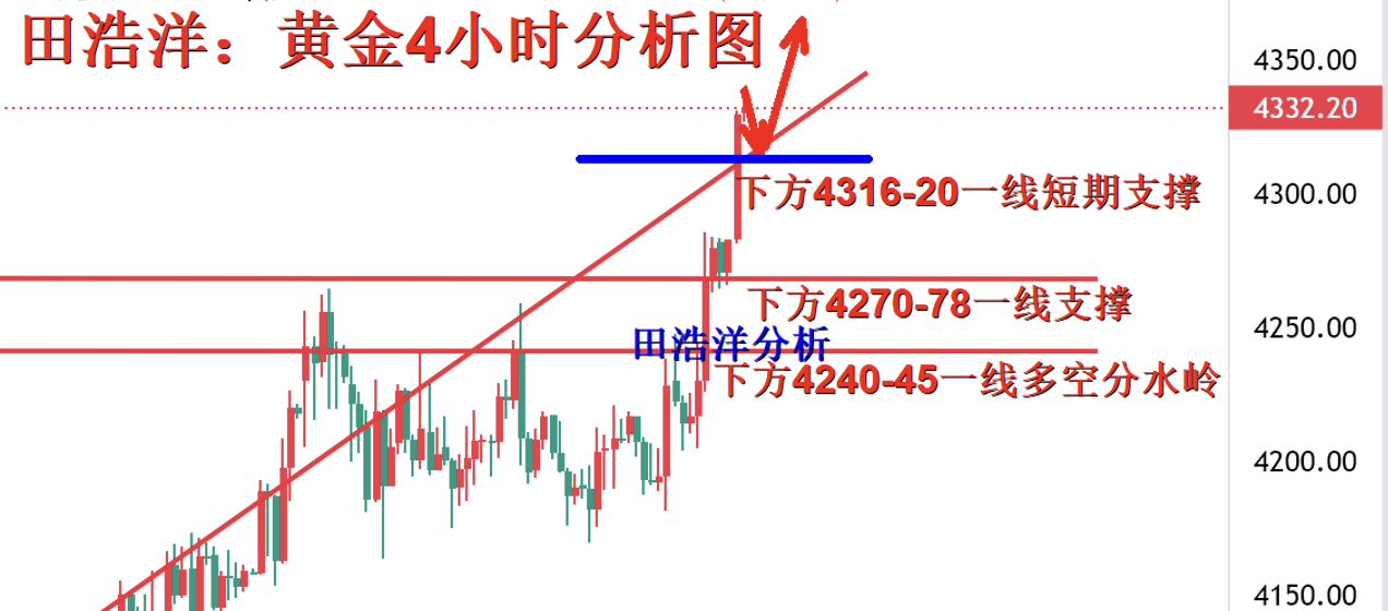 黄金早间小幅回撤于4264附近后继续反弹,多头就是这么强势,今天我们给了回踩4240-45一线做多的策略,但是没有到达就直接反弹了,足以说明多头强势,今天也是周线收官,我们更加要注意午夜防止黑天鹅出现,技术面我们继续以回踩做多为主,技术面各个指标都是利多的,而且小时线均线向上发散,上方我们关注上月高点4380-85一线压制。周五我们尽量谨慎操作为主。如果你目前操作不理想,希望田浩洋能让你的投资少走弯路,欢迎前来沟通交流! 从4小时图走势来看,上方重点关注前期高点4380-85一线重要压制,下方关注4315-20一线短期支撑,重点关注4270-4278一线重要支撑,技术上震荡更倾向于调整回落做