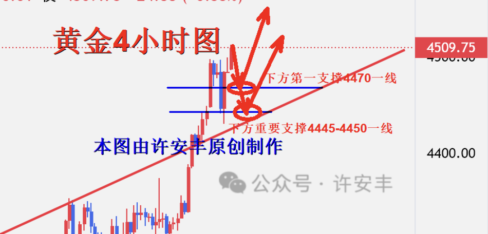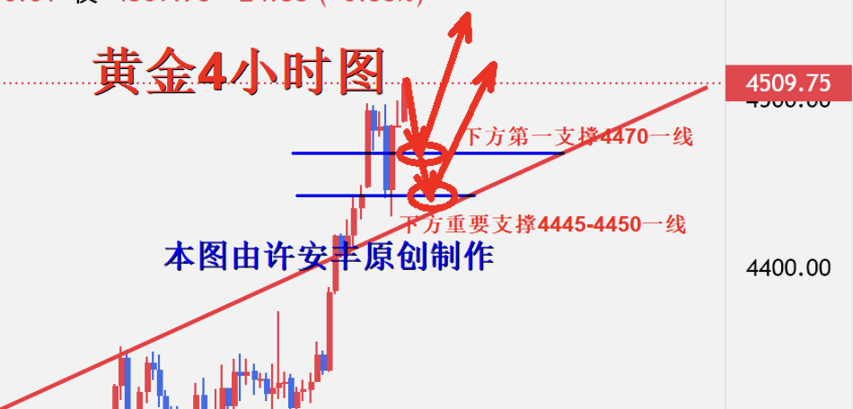 前言:本人许安丰一直专注于黄金市场的波动与走势分析,具有国家注册黄金分析师证书以及机构导师聘书,励志在黄金市场上做一个可以扭转命运的人。 大家早上好,今天圣诞节假日休市,回顾近期本人一直强调做多的思路,并且一直在提醒大家回踩探底就是给机会做多的思路没有动摇过,本人也是积极分析出了多次探底进场的进场位置,这些都是大家有目共睹的,本周以来包括上周末文章分析也是强调本周一开盘必定走上行路线,结果已经知晓,本周开盘一路上行,突破4400关口,之后便一发不可收拾,接下来突破4500,也许是上涨太快或者是连日上涨太过疲乏,最高触及4526一线开启了回踩调整,我们也是在4520一线直接给了做空的策略,完美