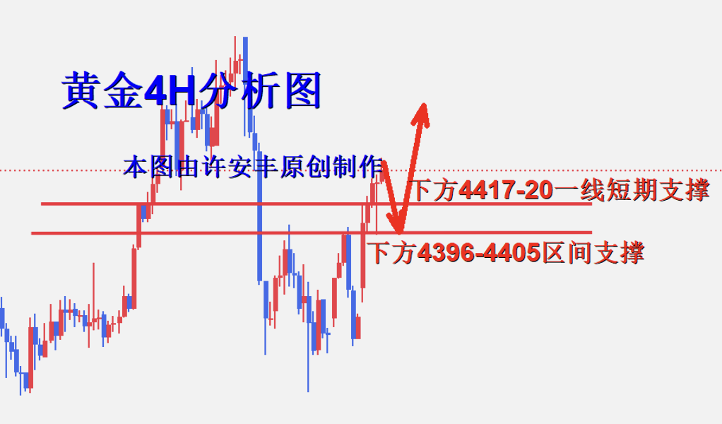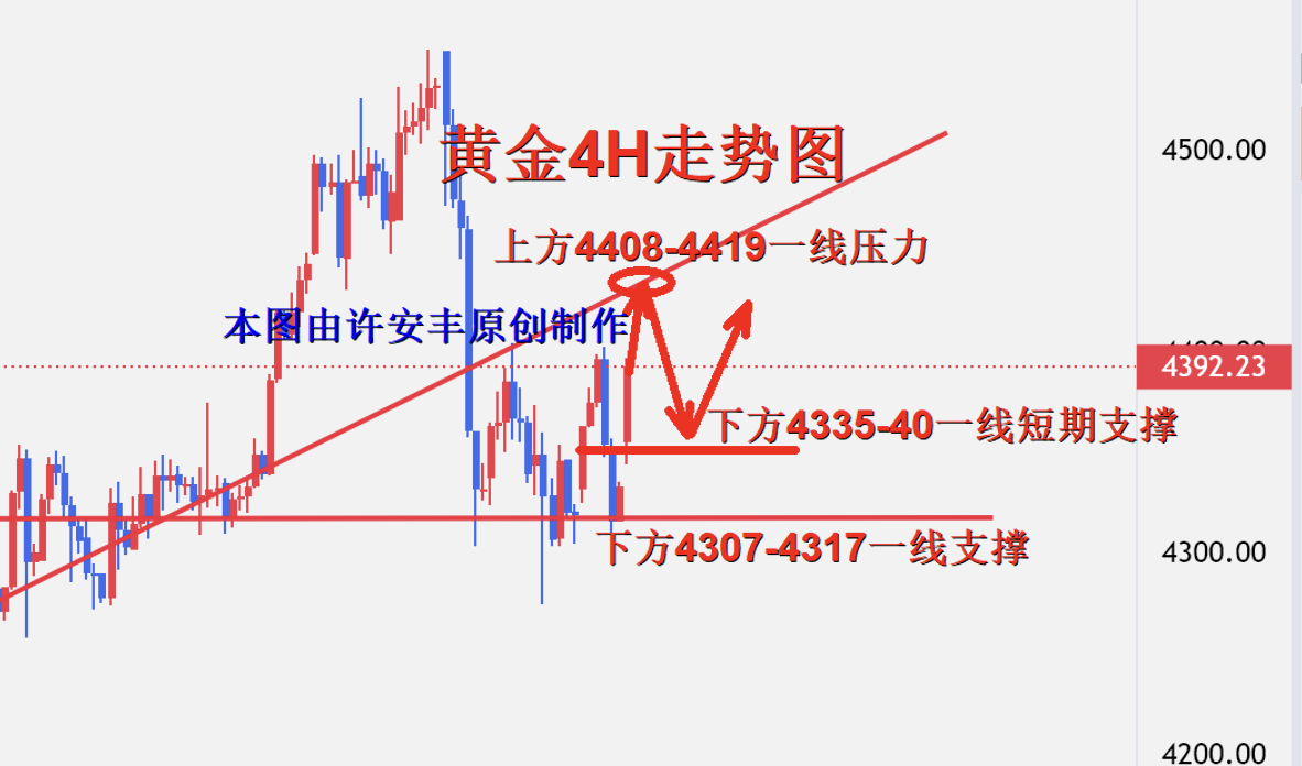 前言:本人许安丰一直专注于黄金市场的波动与走势分析,具有国家注册黄金分析师证书以及机构导师聘书,励志在黄金市场上做一个可以扭转命运的人。 黄金今天开盘在4332一线,最低回踩至4328一线反弹,我们在盘也是直接给了4330-34附近的多单,目前黄金已经反弹4353附近震荡,早盘虽有回调,但是多头趋势依旧没有本质的发生变化,回踩不破继续做多,小时线指标平缓向上散发,那么我们做多一定要把握好进场位置,找准支撑进场位置,继续4325-4335一线区间内进场做多,本周一瀑布式下跌也直接刷新了近期内的趋势,而目前黄金继续处于小幅的反抽之中,而上方的重点压力则维持于整数关4400-4418一线位置,单日