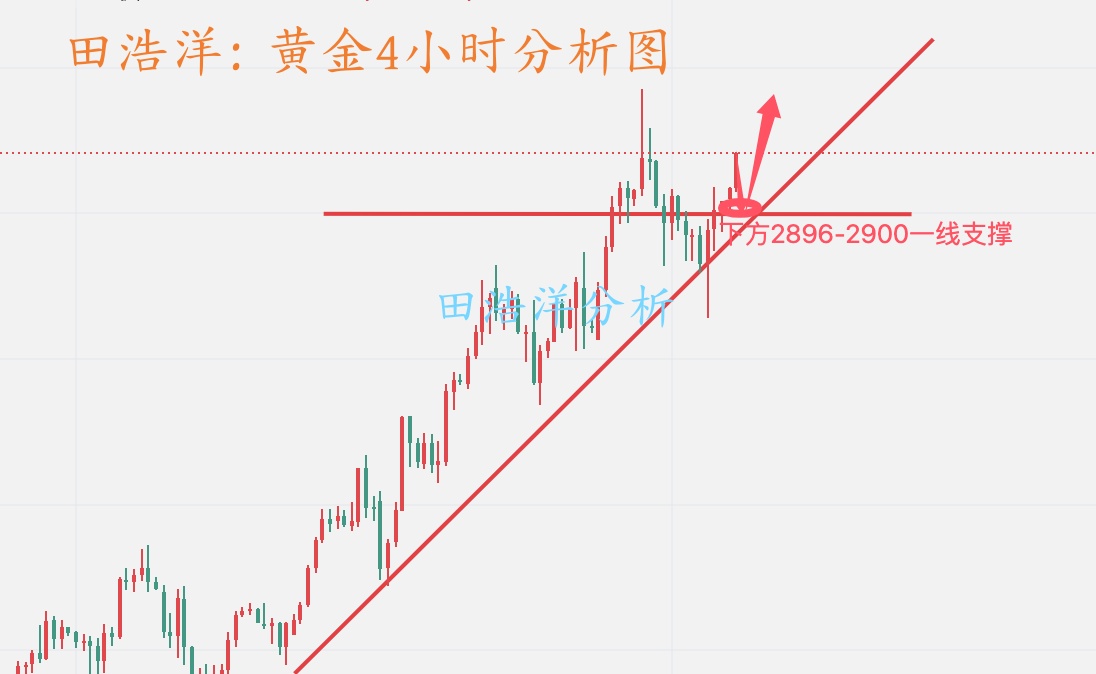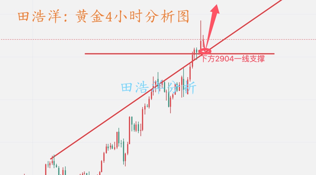 黄金凌晨多头继续冲击,昨晚我们实盘通知2906-10一线做多,午夜上冲完美获利出局,今天早盘开盘,黄金最高2932一线附近震荡,今天我们继续关注下方2910一线的短期支撑,周五黄金即将迎来周线收官,多头目前依旧表现强劲,上方反弹依旧还有空间,本周收阳线的可能性比较大,操作上回落触底就是给做多上车机会,如果你需要帮助,本人田浩洋会一直在这儿,但如果你连手都不伸,我又怎么能帮到你呢? 目前黄金4小时来看,今日下方支撑继续关注2906-2910一线附近,日内回踩依托此位置先多继续看多头反弹回升延续,上方短线阻力2942-55一线,日内先行依托低多循环参与主基调不变,中间位置一律多看少动谨慎追单,耐