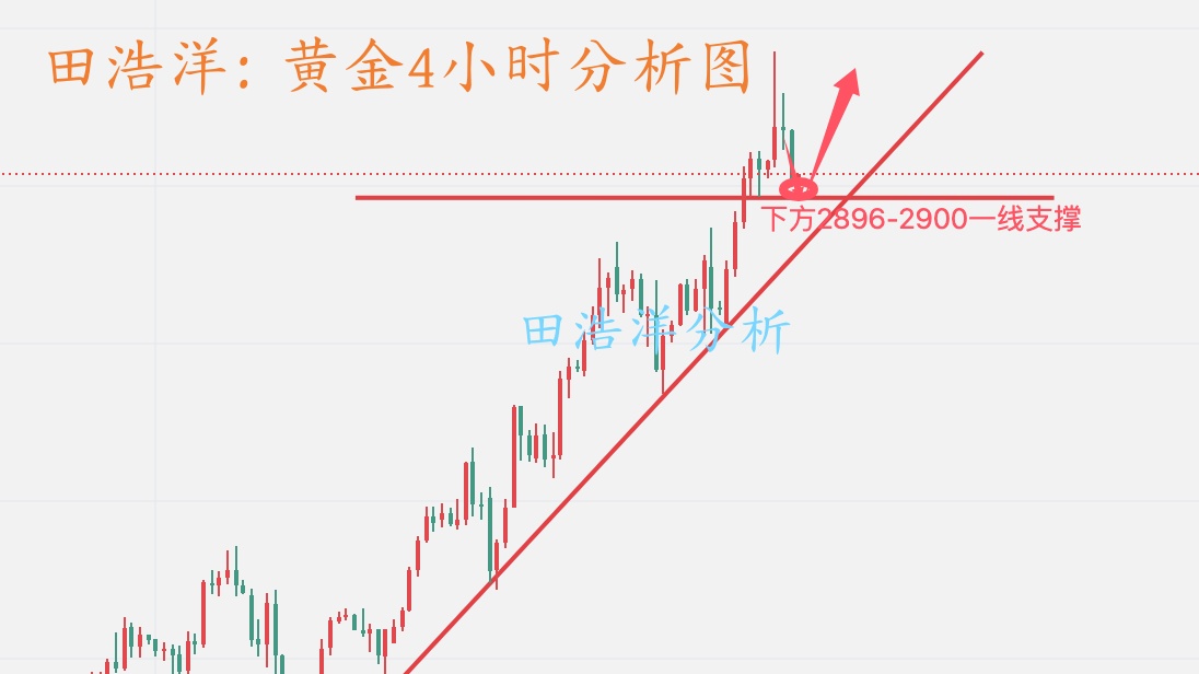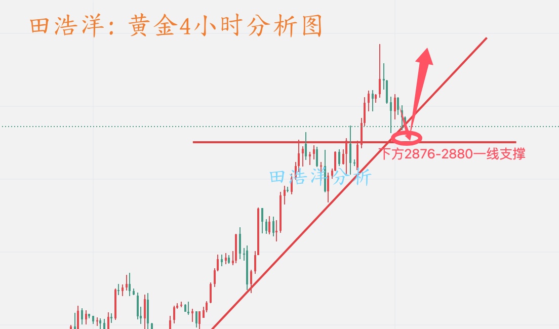 市场瞬息万变,顺势而为,才是王道,趋势来了就是干,不要逆势抄底,免得难受煎熬。交易切记不要意气用事,市场专治各种不服,所以一定不要扛单,相信很多人都深有体会,越抗越慌,浮亏不断放大,搞的吃不好睡不好,还白白错过很多机会,如果你也有这些烦恼,那不妨跟上田浩洋的节奏来试试,看看能否让你豁然开朗。如果你需要帮助,本人田浩洋会一直在这儿,但如果你连手都不伸,我又怎么能帮到你呢? 黄金昨天CPI利空黄金触底反弹,最低触及2864一线,随后直接拉伸2900一线开始震荡,近期我们一直告诉大家以回踩做多为主,今天也是给了2876一线做多,回踩补仓多,黄金反弹也是可以拿住一波利润空间,目前黄金上方我们先关注2