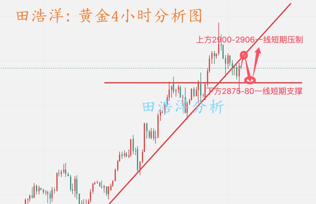昨日黄金技术面在亚盘延续加速冲高刺破2942一线后迎来承压回落震荡走跌,午后欧盘以及晚间美盘接连回落下行击穿2900整数关口重回2890附近震荡运行,凌晨二次反抽触及2908关口在度回落震荡收盘,日K线报收冲高回落吊颈中阴,整体金价在经历连续两个交易日加速上涨后目前短期遇阻2942一线迎来调整,短线下方将进一步回踩试探日线级别10日均线2876-80附近支撑,回踩不破继续找机会做多,如果你目前黄金操作不理想,希望田浩洋能让你的投资少走弯路,欢迎前来沟通交流! 从4小时分析来看,今日上方阻力关注2908-10附近,下方支撑关注2876-2880附近,日内初次回落企稳此位置可多一次再看反弹回升,