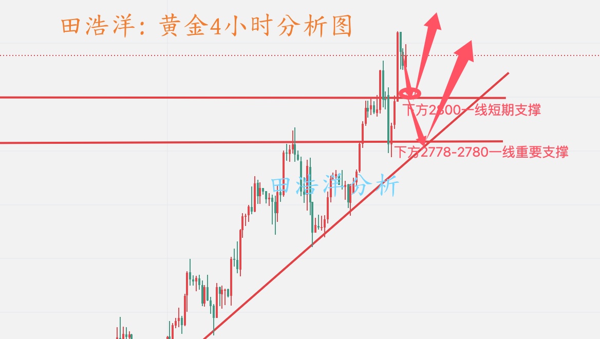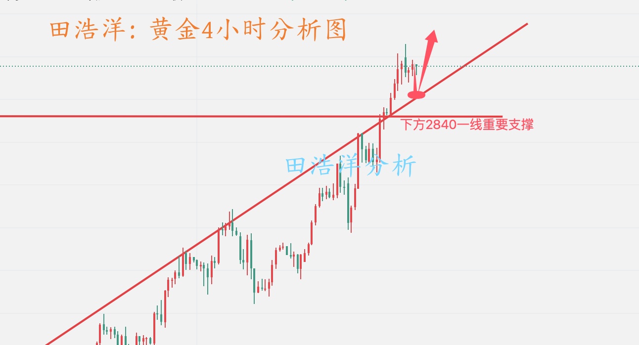 黄金早盘还是持续抗跌,黄金现在还是多头趋势,黄金现在也还是处于蓄势的阶段,黄金短线震荡,黄金多次回踩测试之后开始上涨,黄金依旧继续做多看涨。黄金小时均线还是金叉向上的多头排列,黄金在2840支撑上方还是继续逢低做多,黄金多头还将更上一层楼。黄金空头并没有出现很大的下跌动能,那么黄金多头可能还是要延续上涨,黄金继续将多头进行到底。如果你目前黄金操作不理想,希望田浩洋能让你的投资少走弯路,欢迎前来沟通交流! 从4小时分析来看,下方关注2844-2852一线短期支撑,回踩继续先多看涨不变,上方短线阻力关注2878-80附近,整体依托此区间保持回踩做多循环参与主基调不变。具体操作策略我会在盘中提示,