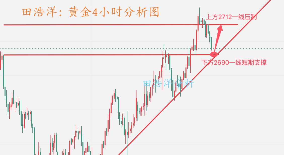 黄金今天比较给力,最低回踩2689一线开启反弹,早上我们实盘也是给了2689一线多和2692一线的多单,最终完美达到目标,相信关注我文章的朋友和实盘操作的朋友都是可以看得到,黄金午夜晚间我们继续以回踩做多进行,毕竟技术面依旧是回踩做多的趋势,所以回踩做多依旧是主要趋势,如果你目前黄金操作不理想,希望田浩洋能让你的投资少走弯路,欢迎前来沟通交流! 从目前4小时分析来看,上方关注短期2712-18一线压制位置,下方关注2690-97一线短期支撑,重点关注2680一线重要支撑位置,操作上我们继续回踩做多为主,保持顺势主基调不变,具体操作策略我会在盘中提示,及时关注。 黄金操作策略: 1、黄金回踩2