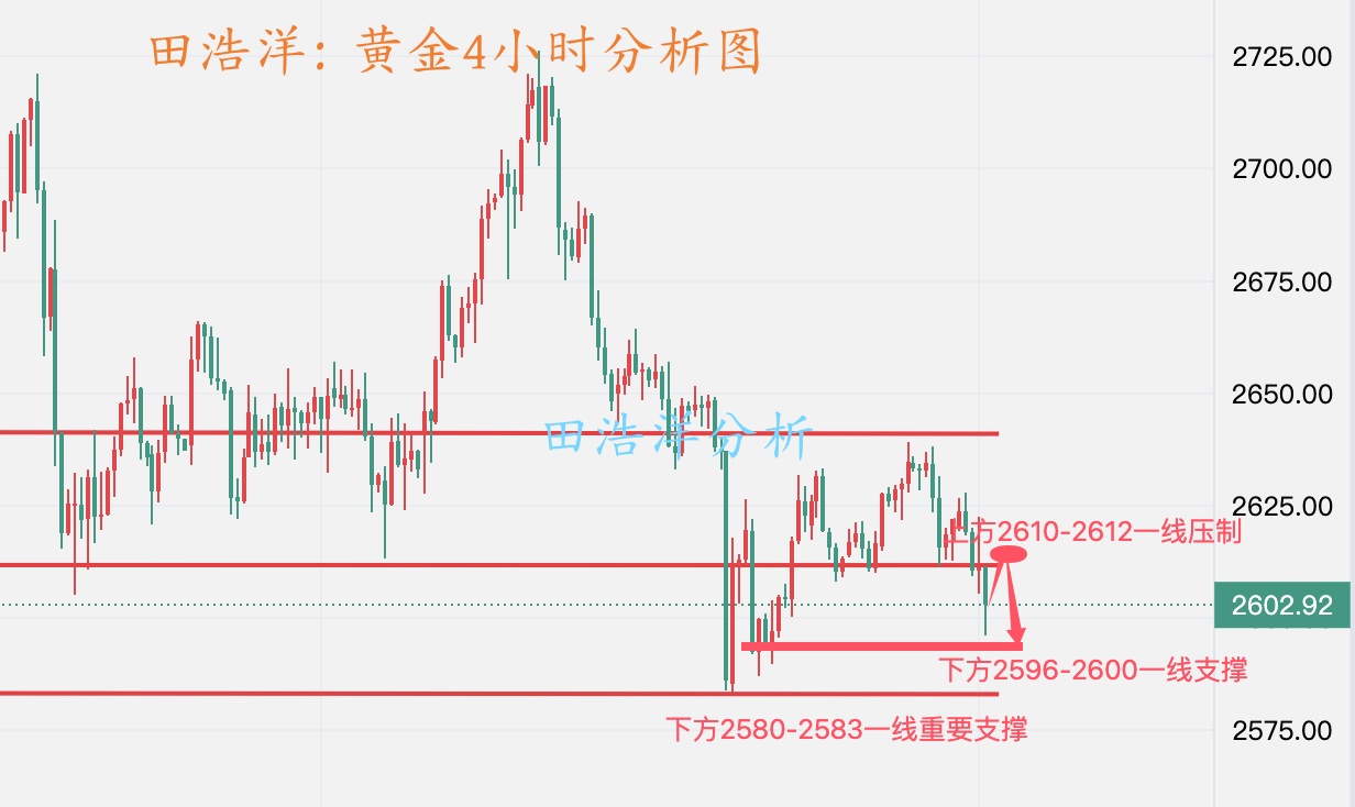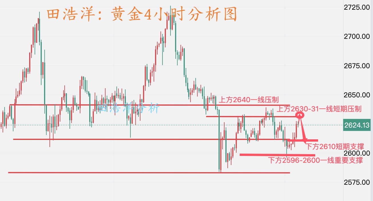 2025年已经开启了,田浩洋先祝看到我文章的朋友和长期关注我文章的朋友节日快乐,是你们的关注和好友交流才让我有继续分析文章和写作的动力,相信关注我文章的朋友应该也了解了行情的实时动向和趋势变化,还是那句老话,本人专业从事黄金分析十多年了,对行情分析来讲说不上最厉害的,但是我对黄金分析来讲绝对是很专业的,因为专注黄金的走势分析,所以我们会更专业,如果你黄金操作上比较迷茫,可以找到我,希望田浩洋能让你的投资少走弯路,欢迎前来沟通交流! 从黄金4小时分析来看,今天凌晨黄金收盘再次从高触及2627一线,但是行情依旧没有反转,周四我们继续先关注短期2630一线压制,重点关注2640一线的重要压制,操作