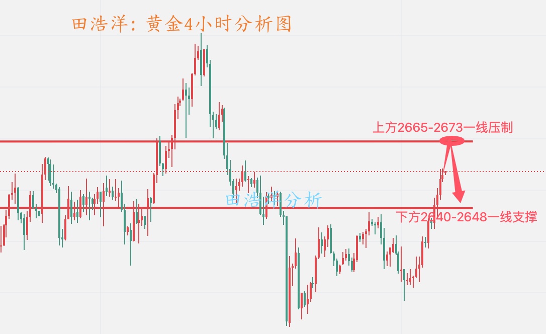 黄金昨晚突破震荡区间之后,黄金顺势开始再冲新高,黄金昨晚回踩2636一线附近后直接再次蓄力冲刺,而且继续连创新高,黄金多头开始强势,黄金昨晚文章也给出了黄金突破了区间回踩2640-45一线可以做多,毕竟前期的多空关键压制也被完美突围,接下来我们以看多为主,但是千万不要高位追多,调整操作思路再进行操作,如果你黄金操作上不理想,可以找到我,希望田浩洋能让你的投资少走弯路,欢迎前来沟通交流! 从4小时分析来看,下方我们继续关注2640-2648一线支撑,上方关注2665-2673一线重要压制,操作上以区间操作为主,中间位置一律多看少动谨慎追单,耐心等待关键点位进场。具体操作策略我会在盘中提示,及时