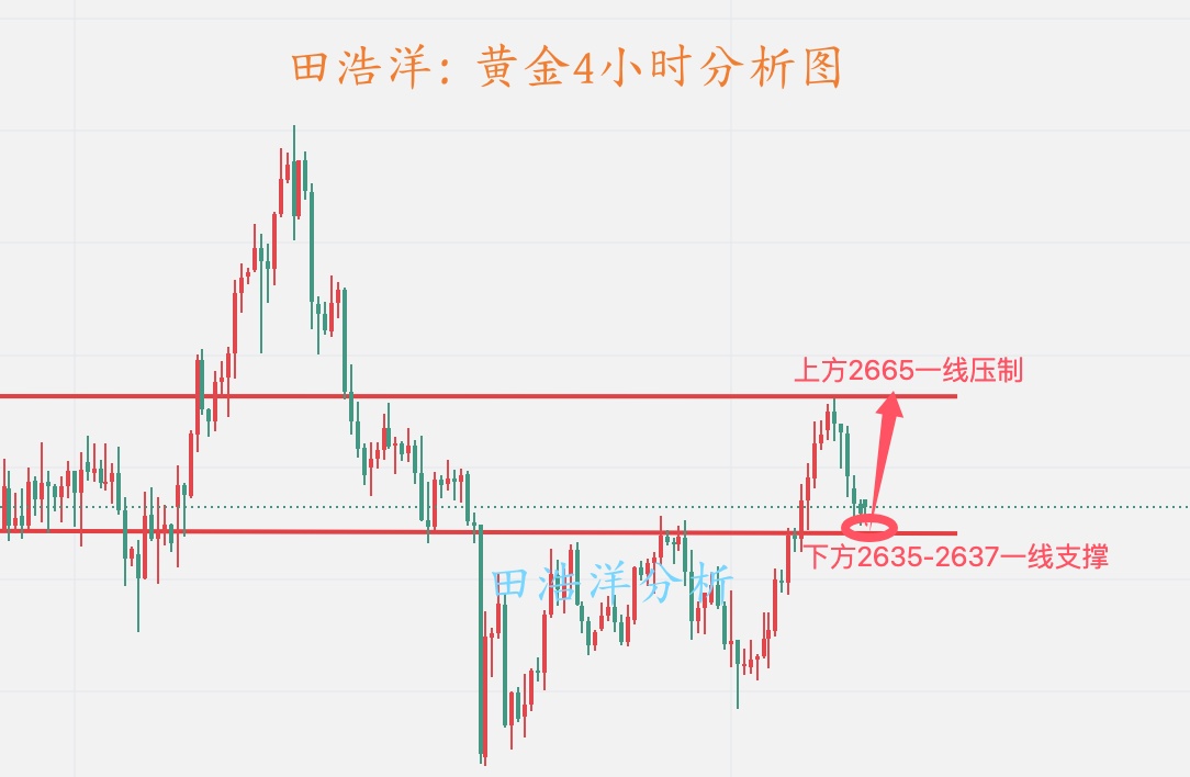 黄金周末本人文章就给了2635-37一线的支撑,今天周一开盘黄金最低触及2637一线附近开始反弹,上周五白天实盘和文章分析给出的2665一线压制做空,晚间给出了2640-43一线做多,虽然多头目前还不够明显,但是下方的支撑却比较强,上方也还有一定的反弹空间,下方继续关注2635-37一线的短期支撑,依旧是回踩不破给机会做多,但是千万不要在高位追多,如果你目前黄金操作不理想,可以找到我,希望田浩洋能让你的投资少走弯路,欢迎前来沟通交流! 从4小时分析来看,上方我们关注2655-58一线短期压制,重点关注2665一线上周高位压制位置,下方我们关注2635-2637一线短期支撑,操作上以区间操作为