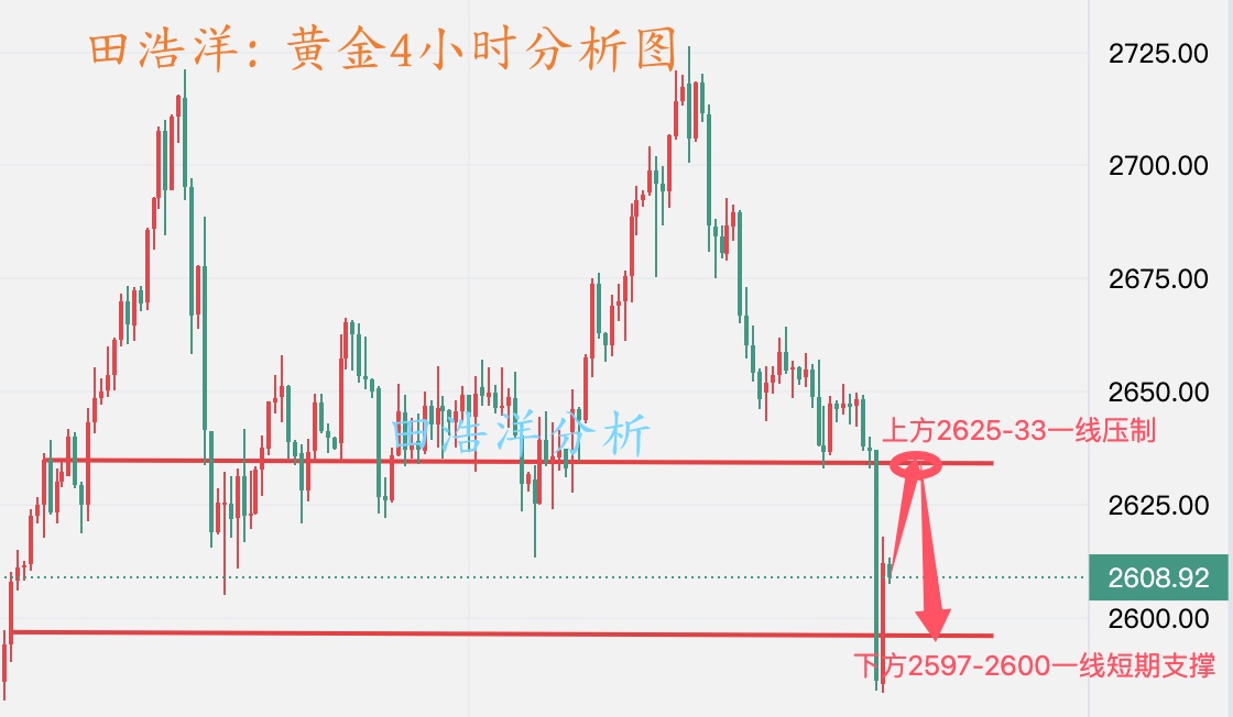 昨日黄金技术面全天压制于2650下方呈现弱势震荡走势,晚间美盘小幅回落走跌回落至2632关口附近横盘震荡,凌晨在议息会议结束后快速向下击穿2600关口形成单边空头下行走势,最终金价收盘位于2600下方报收压制回落长阴,整体金价彻底进入到弱势单边空头形态中,本周全部都是给出空单,相信关注我的朋友都可以看得到,日内反弹继续做空,希望田浩洋能让你的投资少走弯路,欢迎前来沟通交流! 从4小时分析来看,今日上方阻力关注2625-30附近,日内反抽依托此位置继续主空顺势下看回落,下方目标位依旧关注破底,短期多空强弱分水岭2640关口,日线级别承压此位置下方继续保持反抽主空节奏不变,逆势多单一律不参与。具