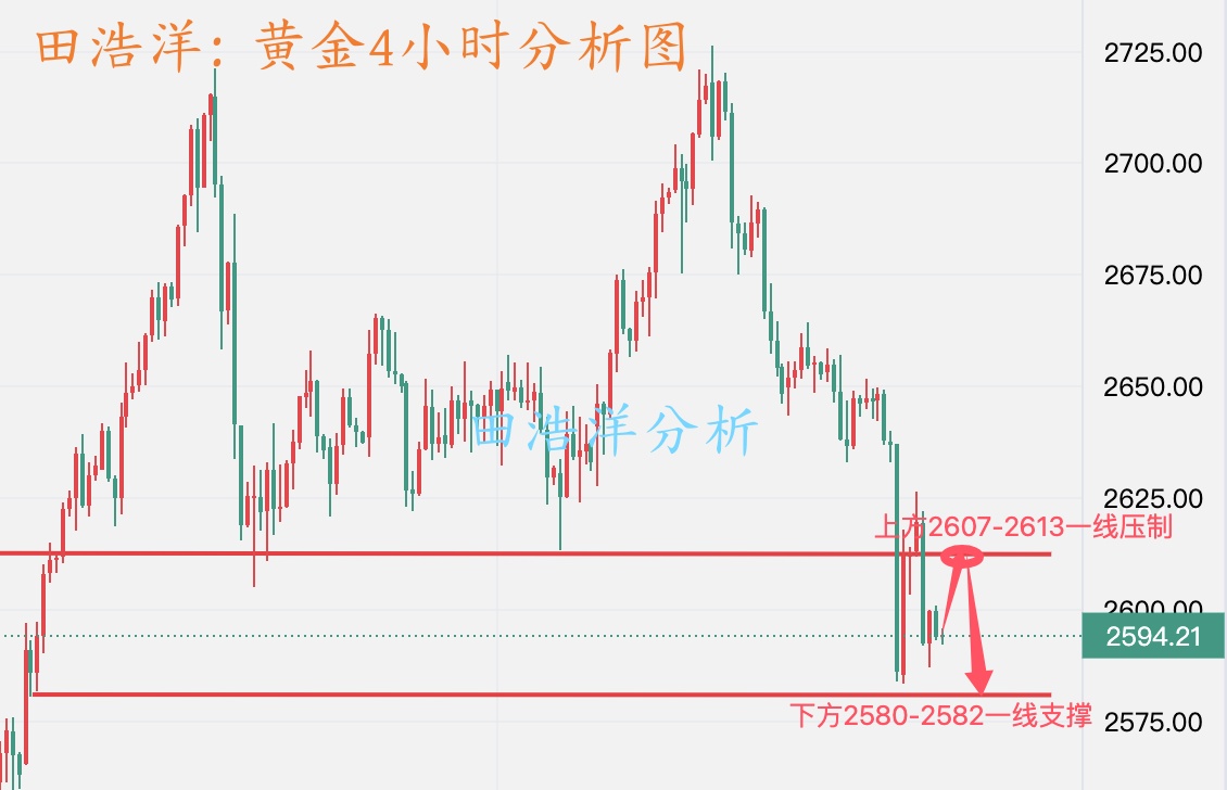 黄金昨天最高反弹2626.6一线回落,相信关注我的朋友都可以看到昨天早上就给了2625-2632一线做空的分析策略,晚间黄金再次突破2600一线继续探底,下方我们继续关注前期低点2580-82一线,依旧是以反弹做空进行对待,从日线和小时线来看,空头都是步步紧逼,空头还有空间,希望田浩洋能让你的投资少走弯路,欢迎前来沟通交流! 从4小时分析来看,下方阻力关注2580-82一线,上方阻力关注2607-12附近,日内反抽依托此位置继续主空顺势下看回落,下方目标位依旧关注破底,短期多空强弱分水岭2640关口,日线级别承压此位置下方继续保持反抽主空节奏不变,逆势多单一律不参与。具体操作策略我会在盘中提