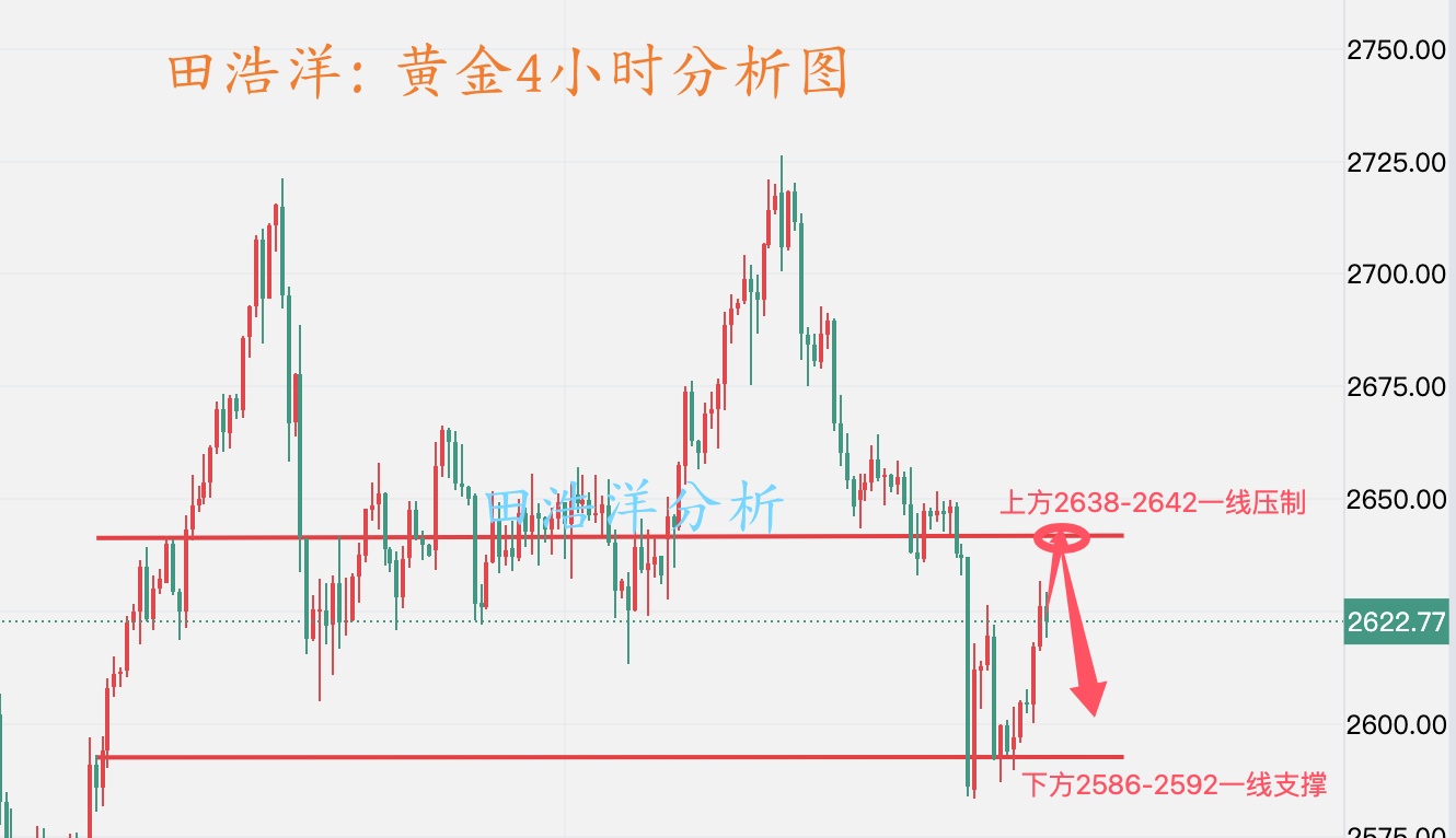 今天周一开盘震荡,很多人今天分析看多,但是其实透过现象看本质来讲,行情趋势并没有反转,如同周末本人分析的一致反弹我们继续看空,今日黄金早盘开盘之后并不强势,以震荡走势进行,黄金暂时还没有单边行情,黄金周初高抛低吸。晚间黄金短线承压2638-42继续空,黄金重点关注2650附近的阻力,下方首先关注2600一线关口支撑,希望田浩洋能让你的投资少走弯路,欢迎前来沟通交流! 从4小时分析来看,下方短期支撑关注2610-08附近,重点关注2586-92一线支撑,上方压力2638-42附近,整体依托此区间保持高空低多循环参与主基调不变,中间位置一律多看少动谨慎追单,耐心等待关键点位进场。具体操作策略我会