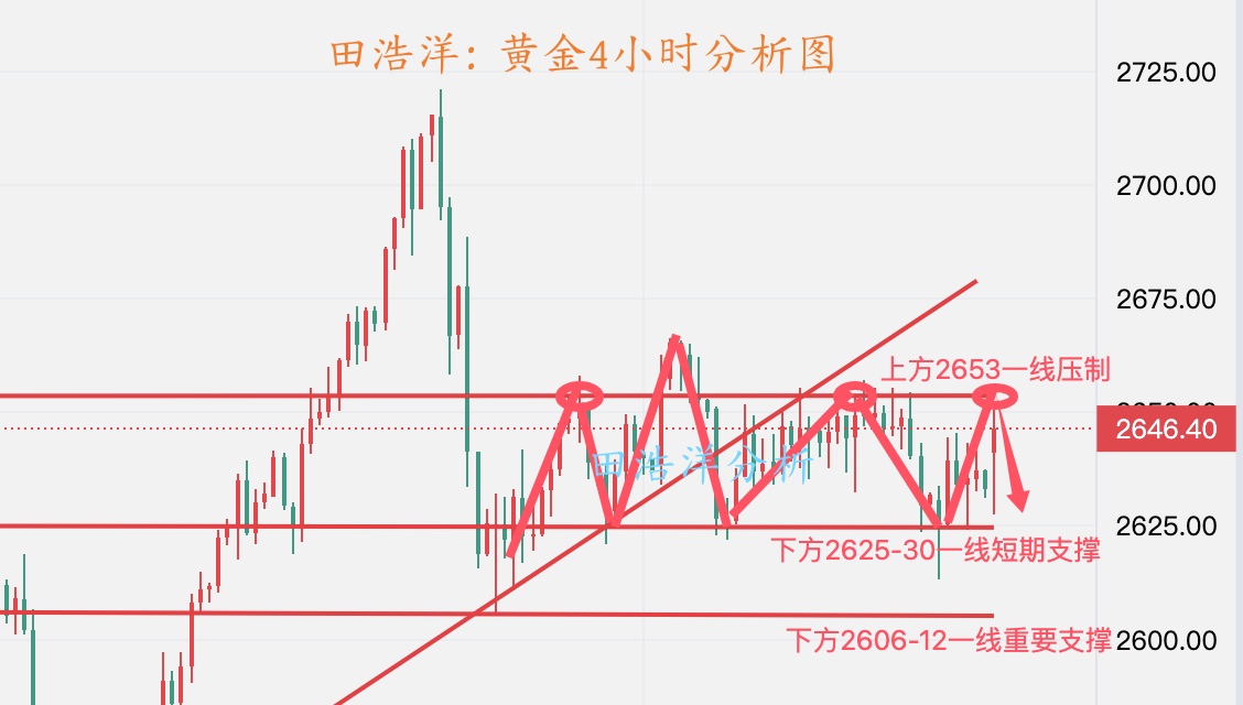 黄金今日早间亚盘小幅跳空高开触及2648一线再次受压回落走跌,最低触及2627一线,周末本人文章分析策略就给出了周一反弹2648-53一线做空,从4小时线来看上周的2653一线压制依旧有效,短期黄金上冲需要借助局势的冲击,但是下方的支撑也是比较强,早间回落2627一线后就再次反弹,没有继续跌破下方支撑,所以我们依旧是以反弹做空的趋势进行操作,希望田浩洋能让你的投资少走弯路,欢迎前来沟通交流! 从4小时分析来看,今日上方我们继续关注2648-53一线压制,日内反抽依托此位置继续主空顺势下看回落,下方我们关注短期支撑2625一线,短期未突破2660关口之前人任何反抽均是做空机会,保持顺势参与主基