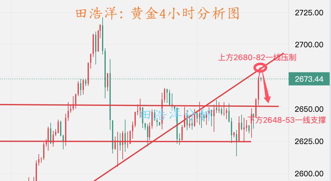 黄金昨晚最高触及2677一线后回踩最低触及2657一线,今天黄金依旧有冲击上方压制的势头,但是我们不能在高位追多,正如昨晚我文章给出,宁可在2675附近做空,也不要在高位追多,随后午夜黄金就跌至了最低2657一线,做黄金不要看到黄金上涨就追多,下跌就追空,这样很容易套住,我们要在合适的进场进行做多做空,哪怕小幅止损也是可以的,如果套住了就会很难受甚至浮亏变大,今天我们继续关注上方2677-82一线压制,反弹不破继续做空,希望田浩洋能让你的投资少走弯路,欢迎前来沟通交流! 从4小时分析来看,今日我们关注上方2682一线压制,下方关注2650-53一线支撑,操作上依旧是反弹受压做空为主,千万不要