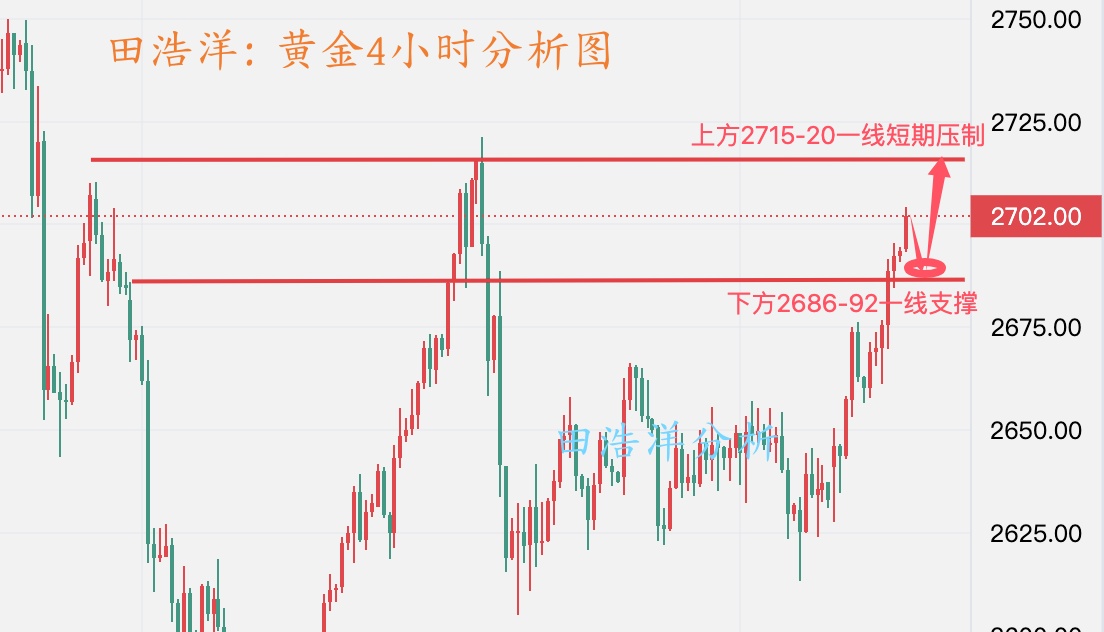 黄金早盘持续冲高,最高触及2704一线后处于2700上方震荡,但是午间一波砸盘刺激导致黄金瞬间回踩,最低回踩至2675一线附近,早间我们给大家2686一线多,2677一线补仓多都是实时通知大家了,多头现在已经冲击2690一线上方震荡,多单全线获利中,我们的目标是看2705-10一线短期压制,技术面来看,回踩依旧是做多的趋势,不要被消息刺激的短暂性回落所蒙蔽,没做多的朋友回踩2677-80依旧可以继续多,希望田浩洋能让你的投资少走弯路,欢迎前来沟通交流! 从目前4小时分析来看,上方短线压力关注2715-20上方,下方短期关注2675-82一线支撑,重点关注多空分水岭2660一线关口,操作上以回