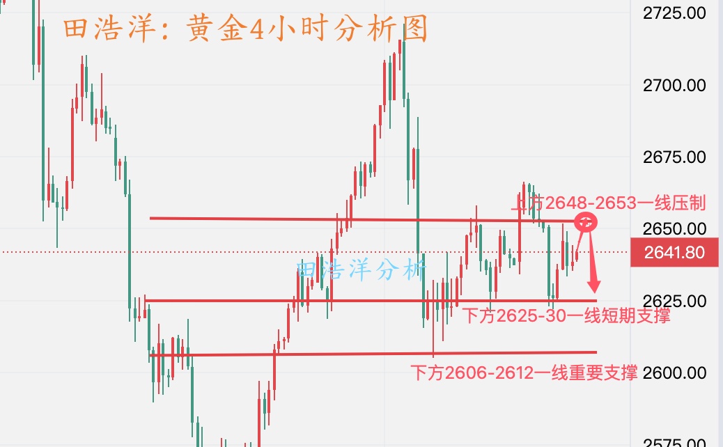 黄金目前处于多空交织状态,在周五大非农数据公布前,黄金以2630-2656一线区间波动进行为主,非农数据公布后就可能起着方向性的突破,但是非农公布前我们就以区间操作为主,反弹上方2653-56一线不破可以介入空单,这也是本周我们多次做空的位置,而且都是比较精准的进场位置,相信关注我的朋友都可以看得到,如果你对操作上存在短板或者不懂得进场位置的把握,希望你可以多关注我的文章分析,最好是能找到我进行交流学习,希望田浩洋能让你的投资少走弯路,欢迎前来沟通交流! 从目前黄金4小时走势来看,晚间下方短期支撑依旧关注2635附近,上方压力2653-60附近,日内继续依托此区间保持高空低多循环参与主基调不