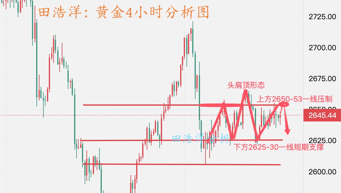 黄金周二像过山车一样,欧盘触及2650一线回落,美盘因韩国政局变化导致黄金一度冲击2656一线,但是依旧是受压回落,最低触及2635一线后开始震荡上行,午夜继续冲击2650一线但是无功而返,最终以震荡2643一线收盘,我们昨天也是多次给了2650-53一线做空,关注我的朋友都是看到,今天我们继续关注上方2650-53一线压制,继续以反弹做空进行,毕竟目前趋势依旧没有改变,操作上比较迷茫的朋友,真诚希望田浩洋能让你的投资少走弯路,欢迎前来沟通交流! 从4小时行情走势分析来看,上方我们关注2650-53一线压制,下方关注2630-35一线短期支撑,重点关注2612-22一线支撑,继续以反弹做空的