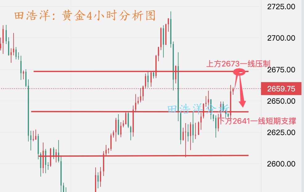周五黄金表现的比较积极,周四晚间进行了探底回升,最低触及2633一线,周五冲击新高,黄金上涨有阻力,不过黄金下方2641也还是有支撑,黄金下周还是预计还是在区间内震荡,黄金下方关注2641一线支撑,回踩不破下方支撑可以先做多,如果黄金跌破2641一线,那么下方还有空间继续下跌。近期黄金走势都是完美符合本人预期,周五我们给的2668-73一线压制做空,周四实盘给出2649空,周三给出2658一线空,周二给出2638-44一线空等等一些实时策略,我相信只要是关注我文章的朋友和我的实盘朋友都是可以看到的,真诚希望田浩洋能让你的投资少走弯路,欢迎前来沟通交流! 目前从4小时走势来看,下周上方关注26