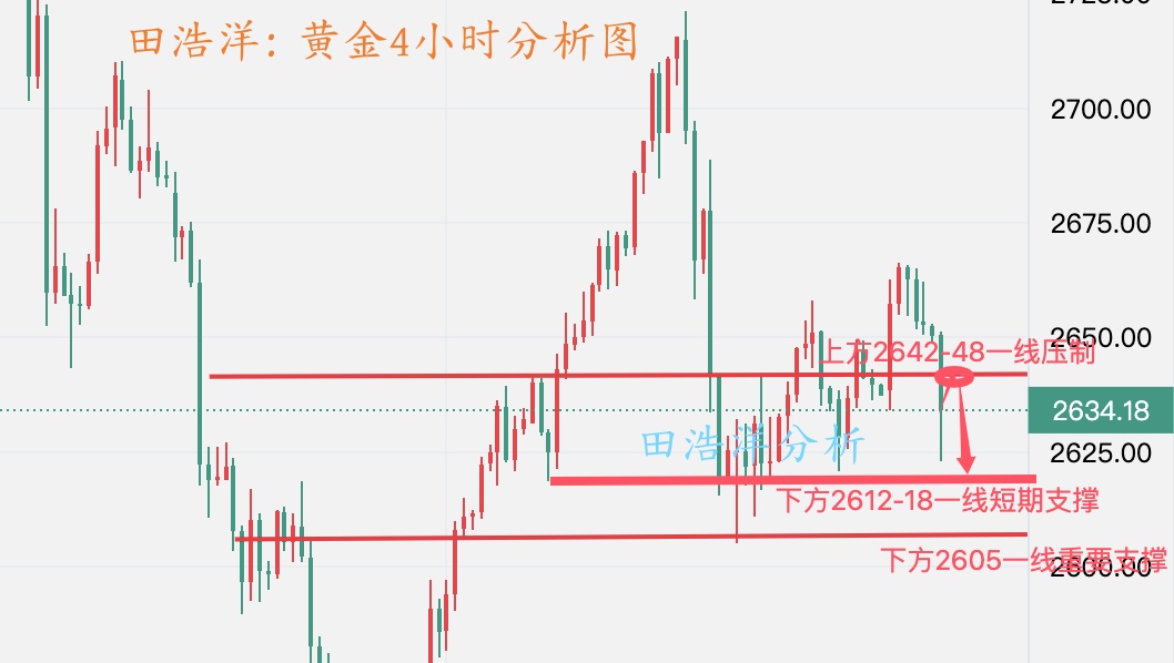 今日早间金价小幅探底2634后开启反弹,计划在2630-31接多,但是没给到机会。欧盘前金价短线走高,最高触及2650一线,我们实盘和文章都给了2650空,已在2640获利离场了,2650一线也是我们今天做空点位,也是昨日美盘反弹高点附近,晚间反弹可以继续进场,防守在2658一线。一旦突破2658有可能继续上行到2668-73一线,这是考虑二次进场做空机会。相信关注我文章的朋友和实盘都可以看得到,目前操作上我们依旧做空为主进行顺势操作,真诚希望田浩洋能让你的投资少走弯路,欢迎前来沟通交流! 从目前4小时线走势分析来看,上方我们关注2648-2653一线压制,下方我们关注2625-2630一线