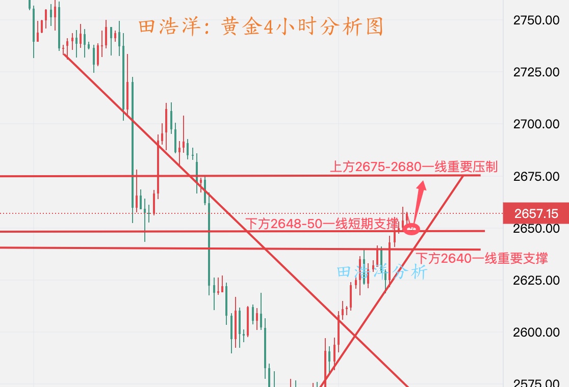 黄金周四白天一直在高位震荡,截止目前最高触及了2671一线,现在依旧处在2668一线震荡,从整体趋势来看,黄金多头依旧是非常强势的,但是上方的2680一线压制也是比较强的,所以高位我们不建议做多追多的,因为技术面随时可能触压回落休整,所以我们以稳健操作为主,以大趋势回落做多才能把握住顺势做多的这波行情,本周来我们多次预测的进场点位都非常准,远的不说,就前天和昨天来说,我们给出了2638-40一线做空,2620-23一线做多,目标基本上都是完美达到,相信关注我文章和实盘的朋友都可以看得到,希望田浩洋能让你的投资少走弯路,欢迎前来沟通交流! 从目前4小时黄金走势来看,上方重要压制看2675-26