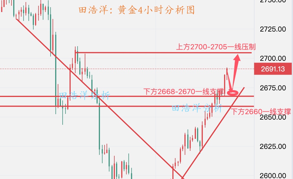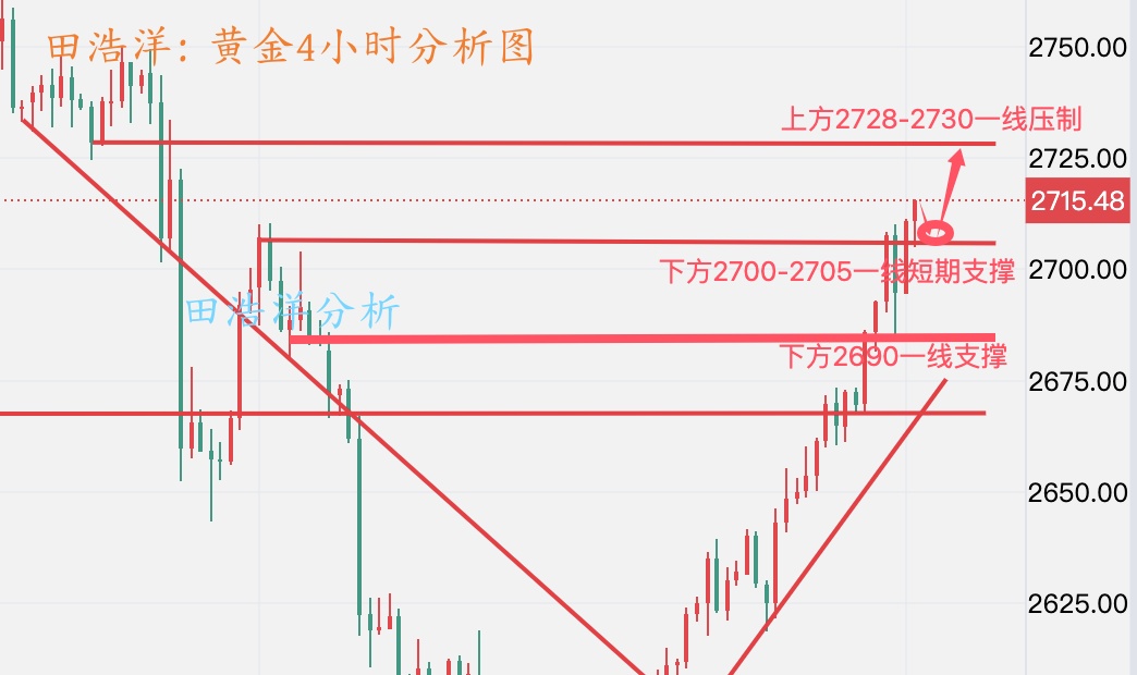 黄金近期连续上涨,黄金触及上方2710一线压制后多头有所减缓,我们今天在2705附近做空,目标看2690-92一线目前已经下来了,黄金趋势虽然还是多头强势,但是需要回踩调整,等黄金回落调整再做多。午夜我们先关注下方2675-80一线支撑,不破此支撑我们可以多,否则反弹2700-2705附近我们依旧可以空,今晚可能技术面需要回落调整,今天周五大家注意控制好风险,希望田浩洋能让你的投资少走弯路,欢迎前来沟通交流! 从目前4小时黄金走势来看,上方重要压制看2705-2710一线,下方短期支撑关注2675-80一线,下方重点支撑关注2658-60一线,操作上我们区间多空操作,耐心等待关键点位进场。具