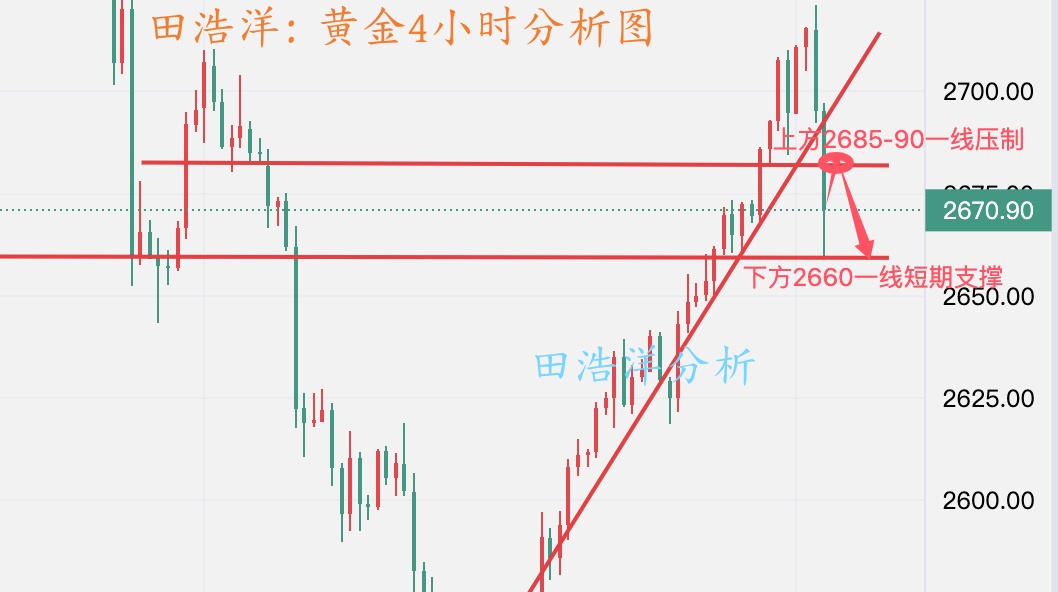 黄金今天周一开盘先上涨最高至2721一线,然后开启了瀑布似的暴跌模式,我们在2715一线多没来及获利出局已经止损了,虽然很遗憾,但是像这样的大行情来讲止损也是正确的,毕竟行情单边下跌四五十美金是很多人难以扛住的,目前黄金最低触及2660一线,2660一线也是上周四冲高的支撑点,现在我们继续关注2660一线的短期支撑的突破情况,对多头暂时不要太乐观,毕竟大跌之下还有震荡的空间,希望田浩洋能让你的投资少走弯路,欢迎前来沟通交流! 从目前4小时分析图来看,上方关注2785-90一线短期压制,下方关注2660一线短期支撑,操作上先反弹做空进行对待,耐心等待关键点位进场。具体操作策略我会在盘中提示,及