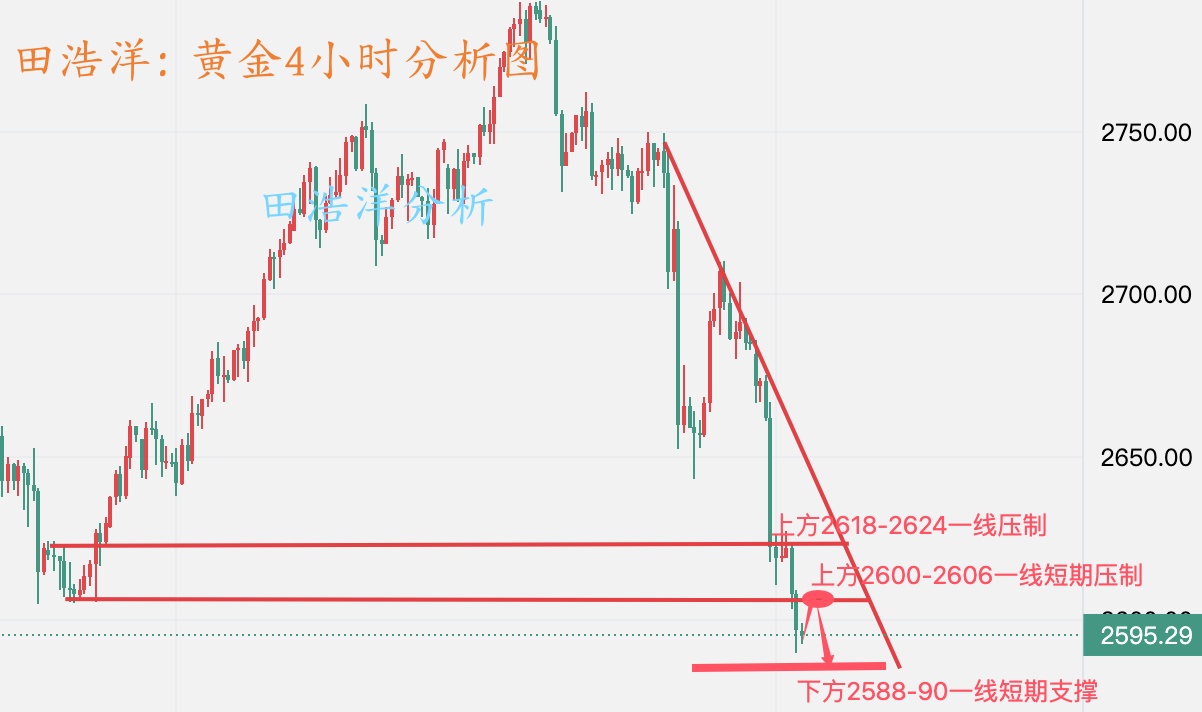 截止目前为止,黄金已经跌破了2600关口,黄金到底要去哪里?川普上台黄金到底要跌哪里?今天黄金依旧是反弹无力,完全没给到我们所要进场做空的位置就下来了,黄金追空也不适合,上周四黄金跌至2643一线后反弹至2710一线,形成了一个V形反转,追空的人也会被止损,在突破2700上方后很多人看涨上周五很多人也被套在了2700一线上方,这就是追多和追空的结果,相信关注我的朋友知道我是一个比较稳健的老师,我们以做趋势为主,看空我们不追空,追单容易追到地板上,大趋势一定要严格带上止盈止损,希望田浩洋能让你的投资少走弯路,欢迎前来沟通交流! 从现在的行情走势来看,上方短线阻力关注2600-2605附近,强阻