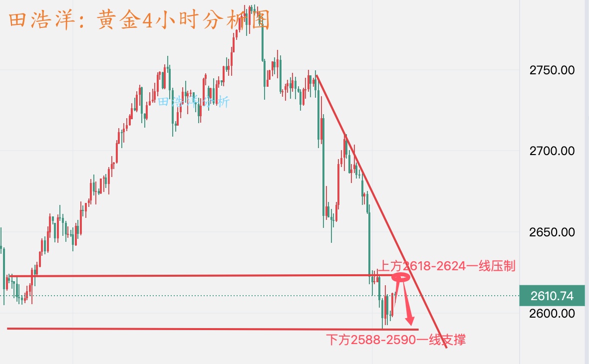 昨日黄金技术面在震荡交投中迎来多空宽幅震荡洗盘走势,亚盘金价延续前一日弱势下行调整,午后进一步向下击穿2600关口到达2589附近企稳回升,最终金价在美盘形成探底回升强势反弹至2617附近在度承压回落走跌,凌晨收盘重回2600下方报收压制回落中阴,整体金价连续三个交易日以调整中阴收盘,近期黄金反弹就是给做空机会,田浩洋多次强调黄金做空是趋势,希望田浩洋能让你的投资少走弯路,欢迎前来沟通交流! 今日下方关键支撑关注昨日低点2588-90一线,日内企稳此位置可短多一次看反弹回升,上方短线阻力关注2618-24一线关口,强阻压制2638-40一线,日内先行依托此区间保持高空低多循环参与主基调不变,