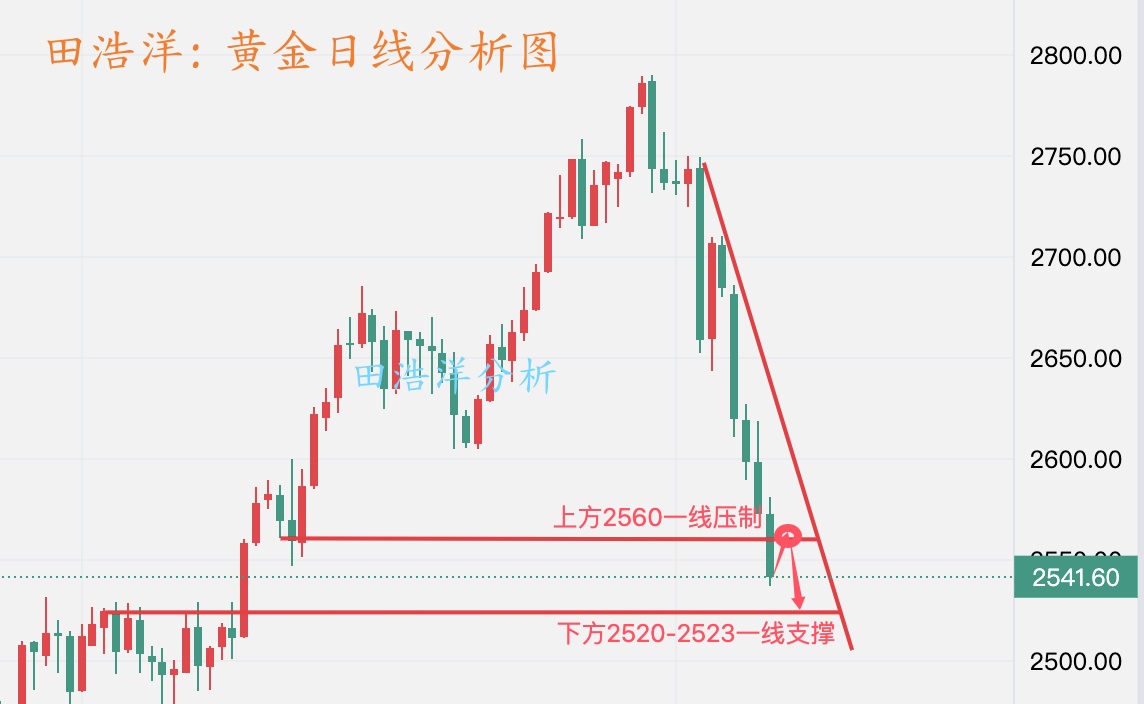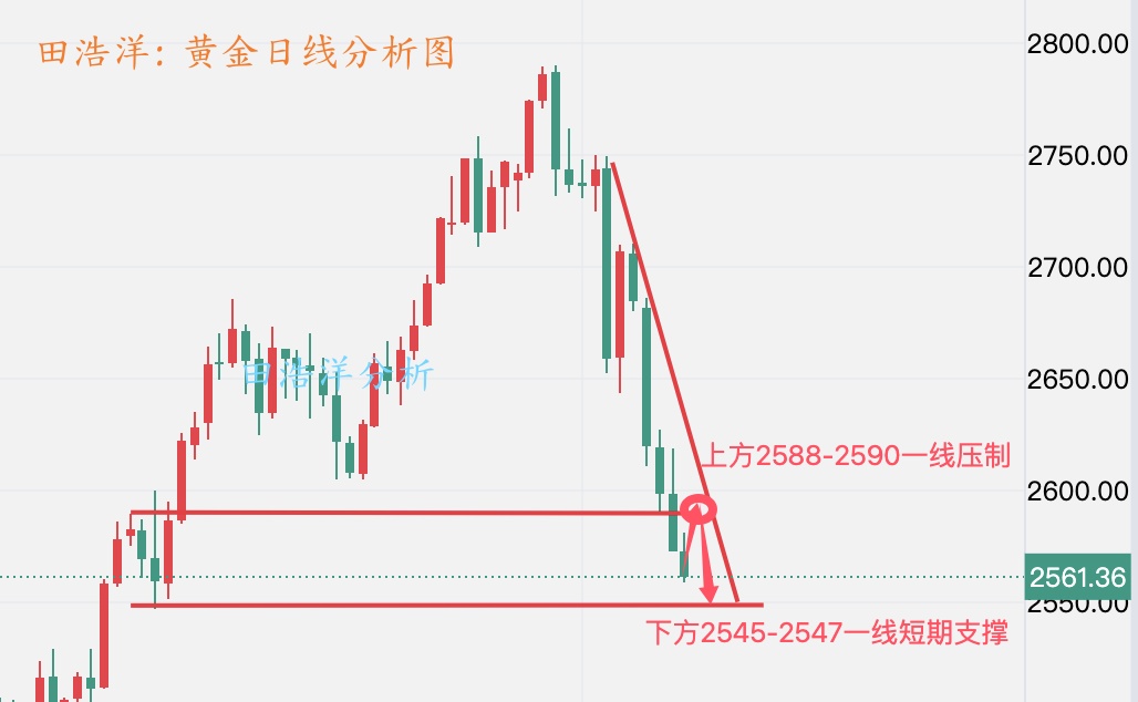 黄金昨日受美盘数据的影响,再度冲高回落,最高触及到2618附近后开始下跌,延续到目前为止,最低触及到了2537一线附近位置,跌幅近80美金左右,也是自历史高点2789下跌以来,本周也是走出了较强的空头趋势,连续的阴线也继续组织了下跌的能量,但是在连续下跌的行情之中,区间震荡就是多空修复的一种方式,并不是反转的信号,所以空头延续下跌也是我们的意料之内,日线连续阴线,小时线也是处于下跌的形态之中,短线内我们仍然已做空的思路来进行操作,保持一直做空节奏。希望田浩洋能让你的投资少走弯路,欢迎前来沟通交流! 从日线分析来看,晚间上方阻力关注2560一线压制,反抽依托此位置继续主空顺势下看回落,下方目标